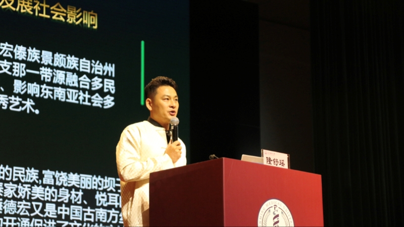 傣剧艺术家冯散保老师围绕《国家非物质文化遗产——傣剧》展开讲述,讲座中穿插傣剧《刀安仁》选段的表演,一颦一念皆传神;现场教学的孔雀舞片段,一举一动尽显功底,生动诠释了傣族艺术刚柔并济的美学内涵。整个互动环节欢声不断,老师的倾情相授与学生的专注投入,共同绘就了一幅民族戏曲薪火相传的生动画面。