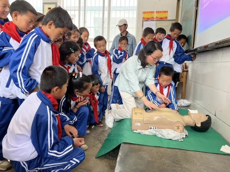 7月12日上午,服务队抵达丽江市玉龙县宝山乡高寒村后,玉龙县乡村振兴局副局长和国军、宝山乡党委书记杨叁山、乡党委副书记熊晓斌组织志愿服务队和我院乡村振兴驻村队员进行了座谈,总结了我院对宝山乡16年以来定点帮扶的重要举措和成果。随后,服务队抵达高寒完小,立即开展了“讲一个医学课堂”“做一个急救培训”活动。李政副教授为高寒完小的同学们讲解了眼卫生、手卫生知识。蒋蕾护士长以互动教学的方式,带领学生学习了规范的“七步洗手法”,并运用心肺复苏模型,对同学们进行了安全教育及心肺复苏急救培训。