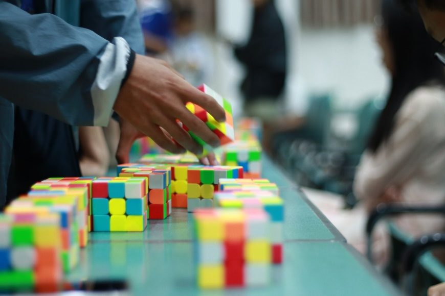 10月27日,魔方协会于西苑致知楼1106举办了全校范围内的魔方趣味拼图比赛。在两轮比赛中,各小组分别利用魔方拼出爱心及中国地图图样。