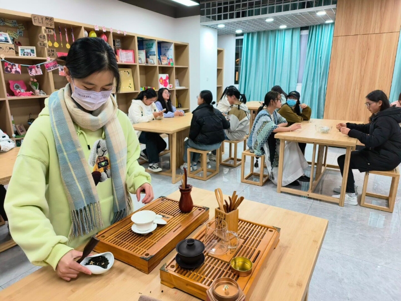 2.霜降茶话会。活动分为泡茶、断句小游戏、茶文化视频观看、趣味竞答四部分。同学们共同展示泡茶手法、品茗喝茶、游戏交谈,让霜降的这一天充满了趣味。