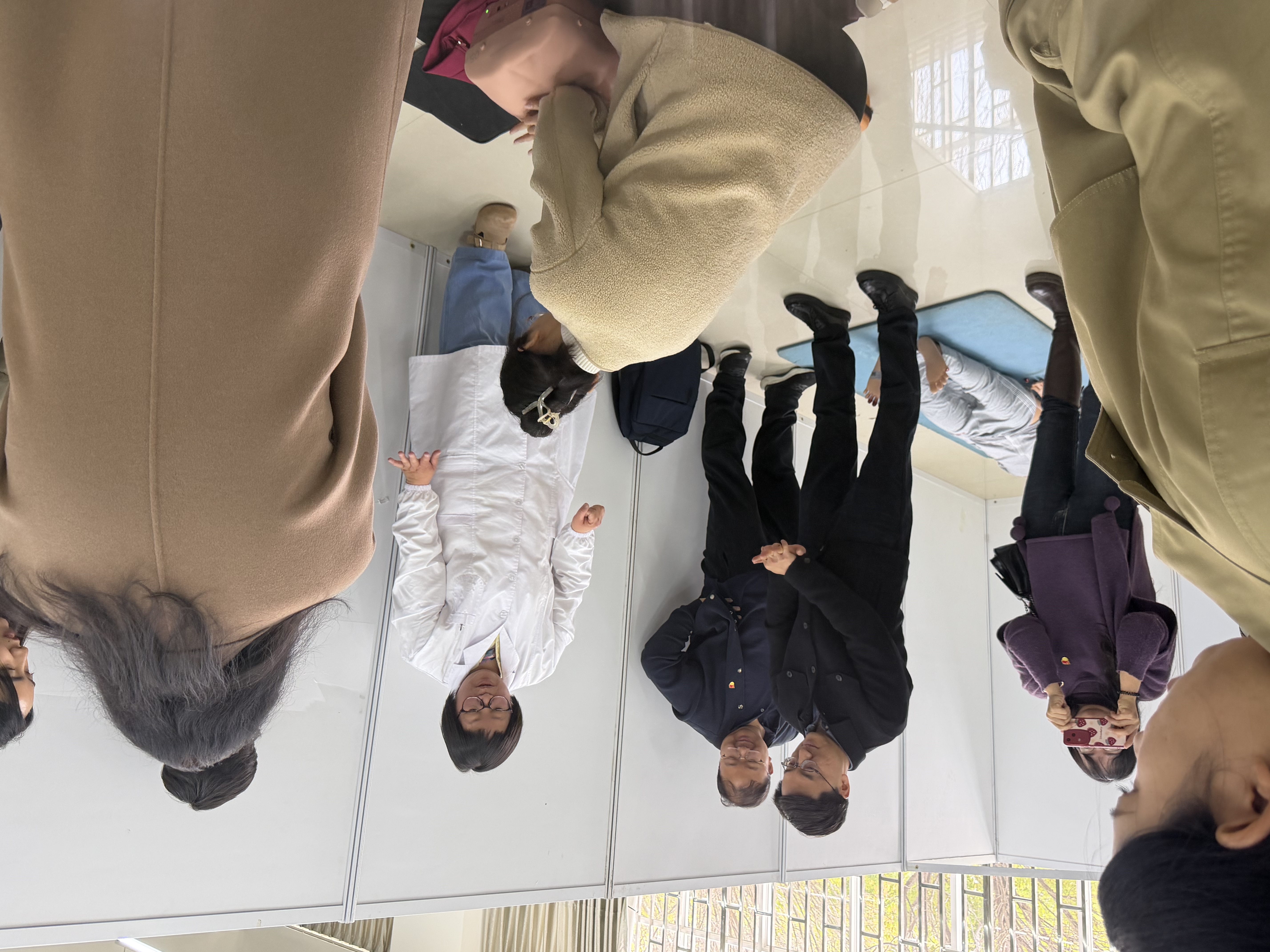中心教师首先向来宾介绍了临床技能中心的功能区设置、主要设备、课程开展等情况。随后,向来宾讲解了成人心肺复苏术、AED使用、成人及儿童海姆立克急救法等内容,到访人员现场利用模型模具进行了实操训练。