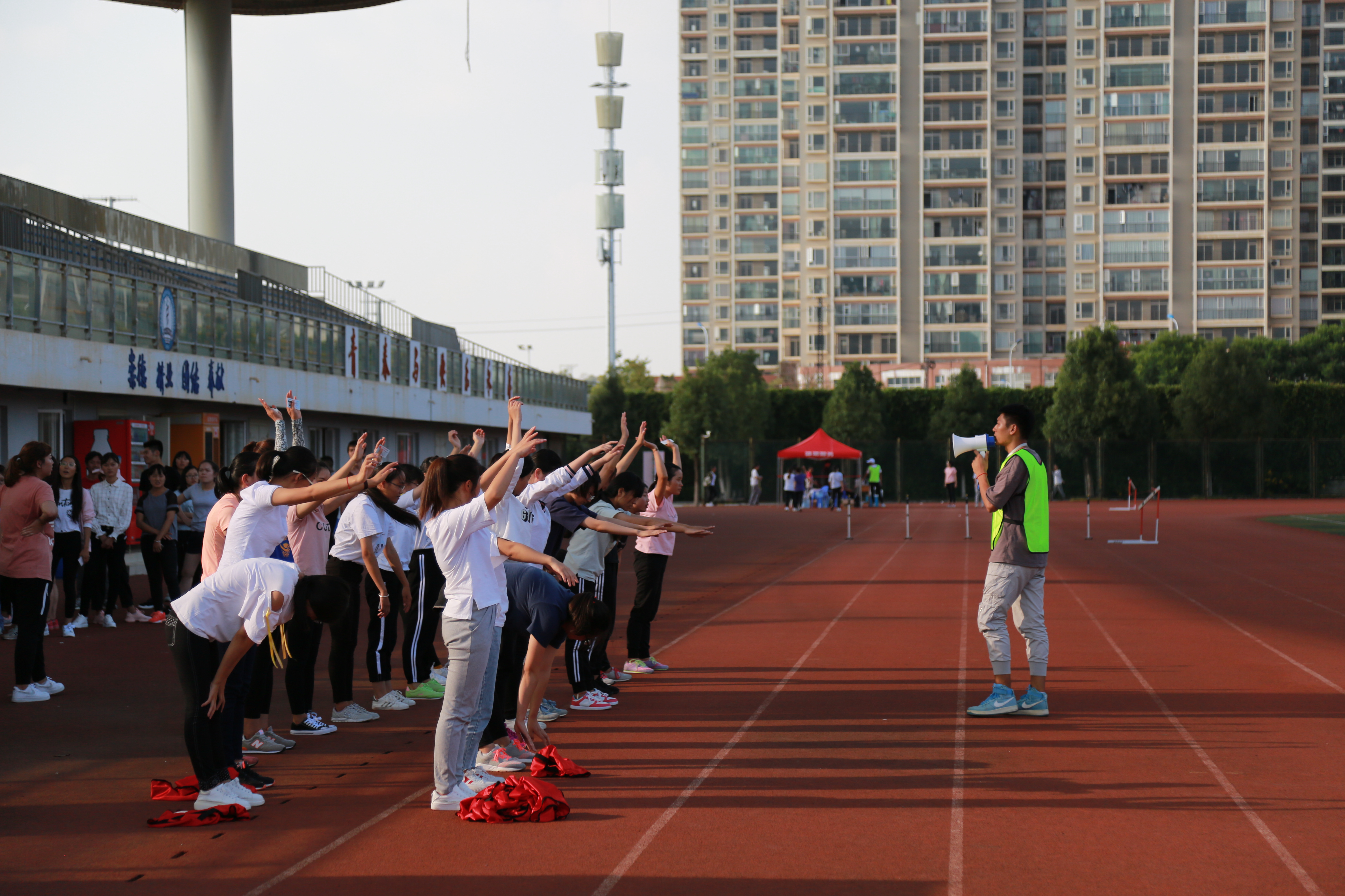 上午9点,学生集合整队、佩戴号码簿、上交证件,在体育老师的指导下,认真完成测试前的各项热身动作。