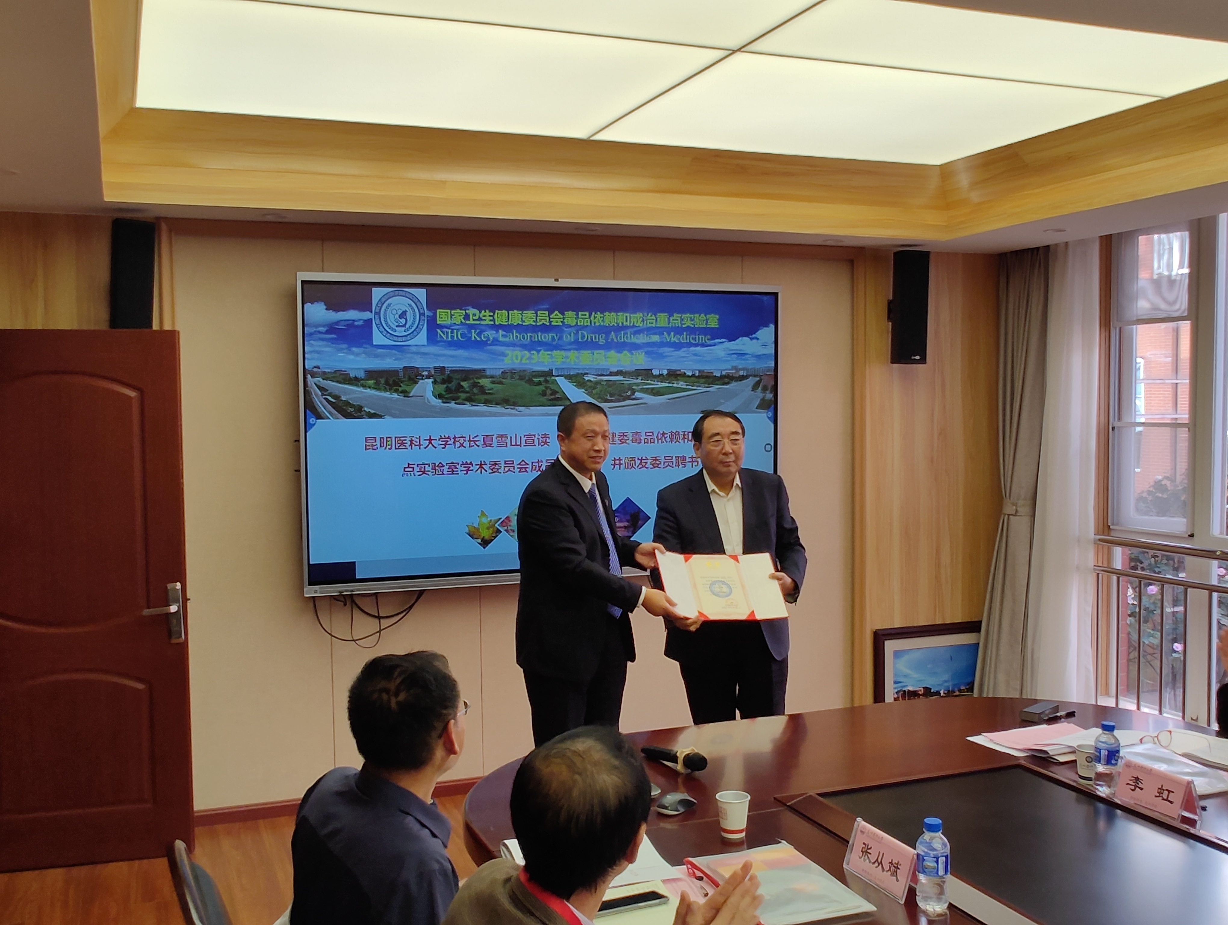 夏雪山指出毒品问题既关系到公共安全,也关系到人民生命健康。云南特殊的时空环境,导致毒品及毒品相关问题尤为突出,已成为制约云南高质量跨越式发展的因素之一。Beat365唯一官方网站在毒品依赖与戒治领域有一定的基础,并具有显著的区域特色,在此基础上2019年获批立项建设国家卫生健康委重点实验室。经过4年的建设,取得一定的成效,但也还有需要进一步提升的空间。此次召开由丛斌院士领衔的学术委员会会议,由衷希望各位委员对重点实验室的建设发展进行问诊把脉,指明方向,为把实验室建设成为特色明显,区域领先的国家部委实验室建言献策。夏雪山同时为各位委员颁发了聘书。