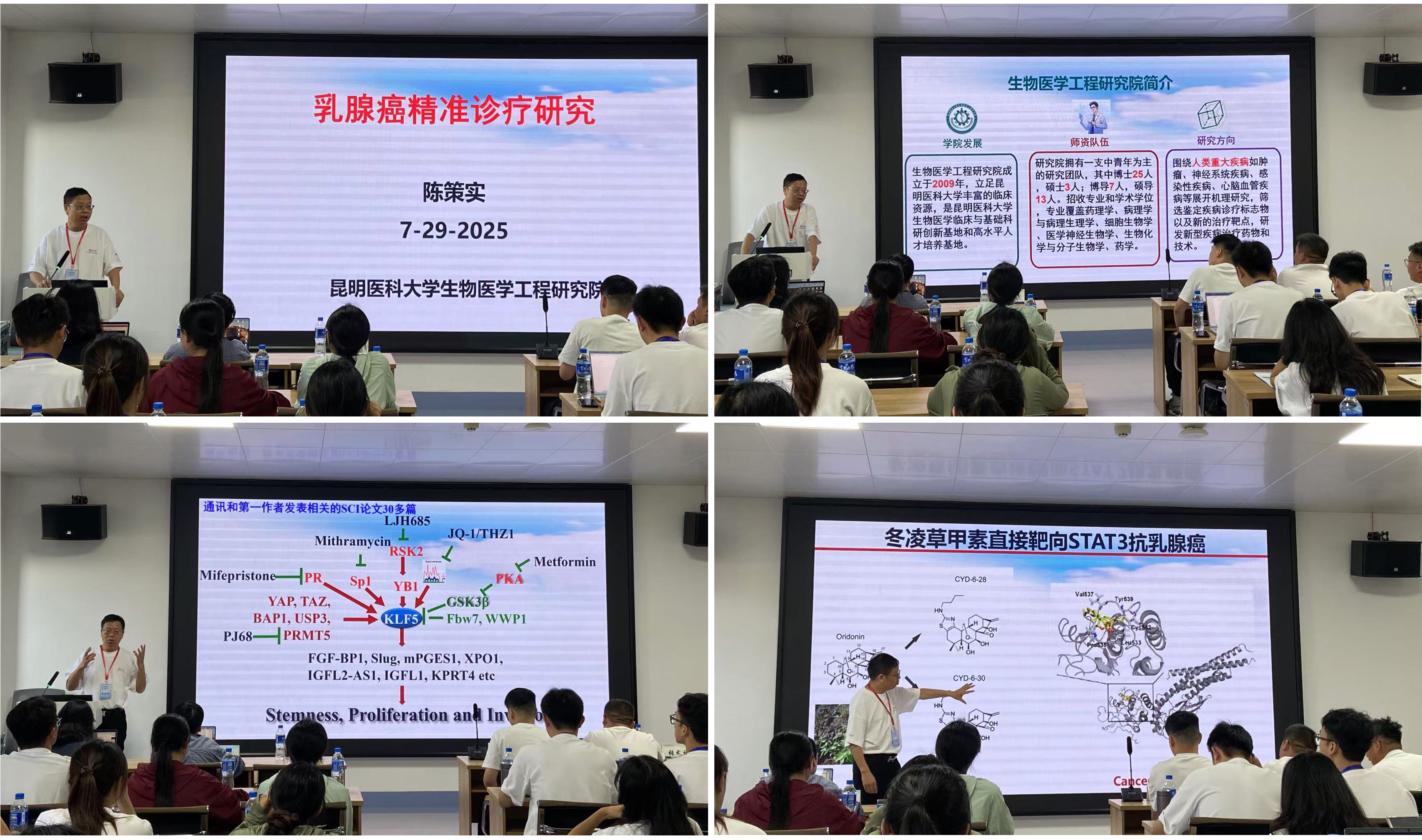 2025年7月29日,Beat365唯一官方网站2025年优秀大学生夏令营的同学们来到Beat365唯一官方网站生物医学工程研究院开展学习与参观活动。陈策实院长从研究院的发展历程、师资队伍、研究方向、科研平台以及科研项目等方面,详细介绍了研究院的基本情况。随后,陈策实院长以课题组在乳腺癌发病机制及免疫逃逸、化疗耐药领域的最新研究为例,围绕转录因子KLF5的调控作用进行科普讲解,用通俗易懂的语言让营员们深入了解了团队在乳腺癌发病机制、动物模型及治疗药物研究方面取得的系列成果。