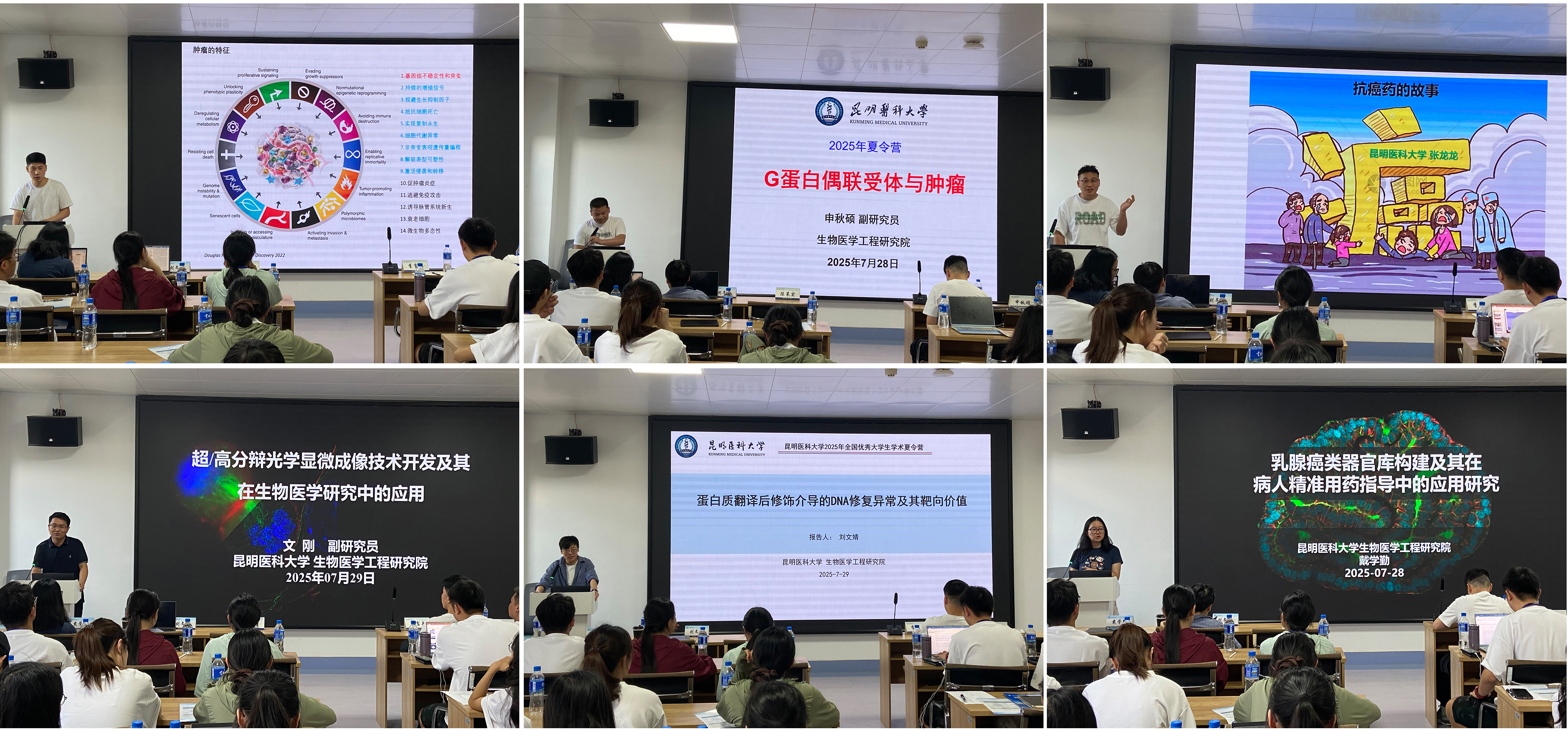 和进展。李富兵老师介绍了泛素化修饰在肿瘤免疫治疗中的前沿研究与成果;申秋硕老师讲解了G蛋白偶联受体在乳腺癌及消化道肿瘤调控机制中的研究进展;张龙龙老师分享了抗肿瘤药物研究的方法及课题组取得的重要突破;文刚老师介绍了超高分辨率光学显微成像技术的研发及其在生物医学领域的应用;刘文婧老师围绕DNA损伤与肿瘤,讲解了蛋白质翻译后修饰介导的DNA修复异常及其对肿瘤放化疗耐受增敏的科学价值;戴学勤老师则介绍了乳腺癌类器官库的建立方法及其在乳腺癌精准用药方面的应用前景。导师们内容丰富、生动有趣的讲解,赢得了在场营员的热烈掌声。