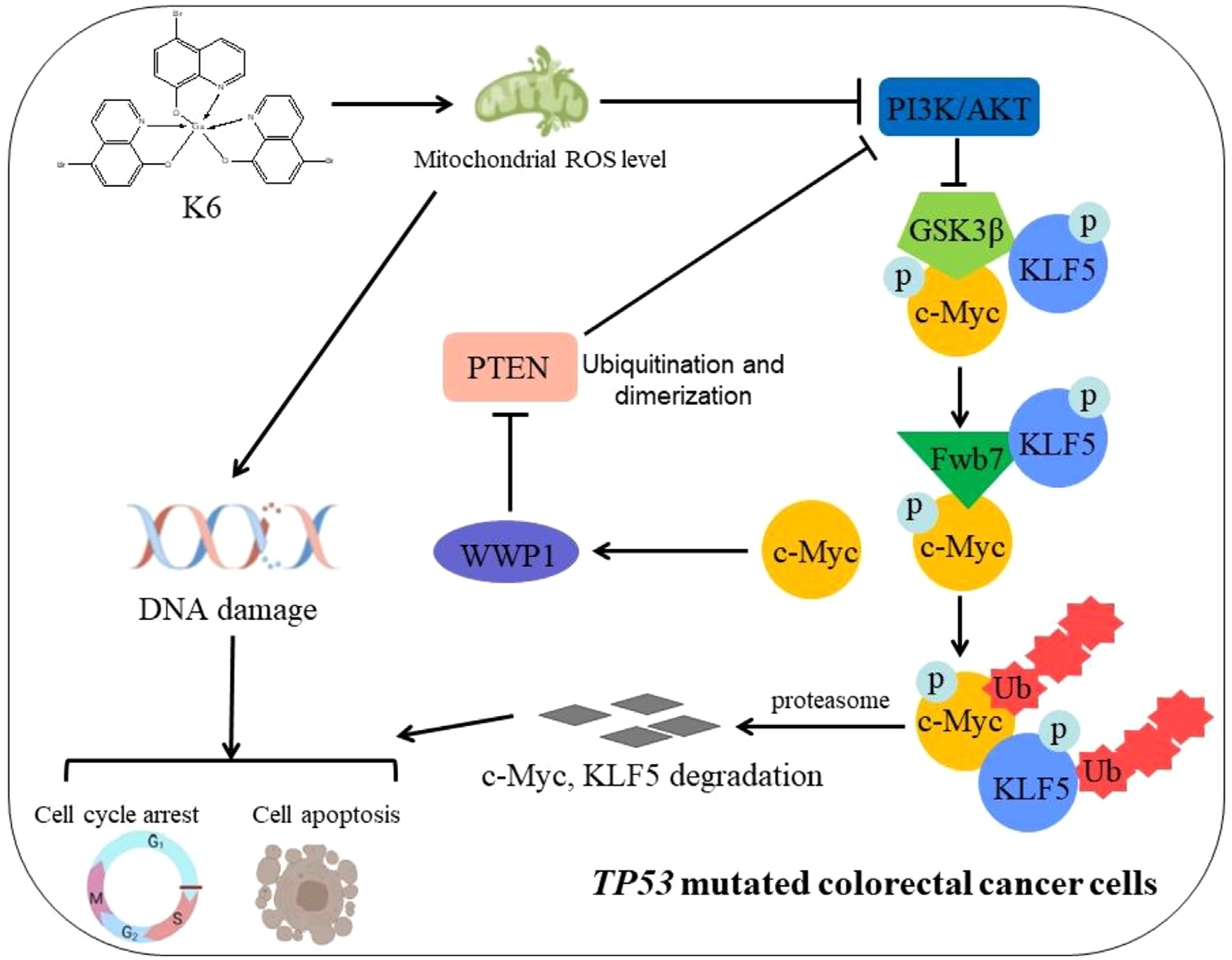 镓(Ga)作为一种与铁性质相似的金属元素,是目前探索金属基抗癌药物的重要方向。本研究中,科研团队经过系列筛选工作,发现了一种名为K6的镓化合物,其在抗肿瘤方面展现出了较好的应用潜力。研究发现,K6不仅在体外和体内实验中均显示出强大的抑制肿瘤生长、增殖及促进肿瘤细胞凋亡的能力,而且对于携带TP53基因突变的CRC细胞,其疗效显著优于传统药物奥沙利铂。深入机制研究显示,K6通过提升细胞内活性氧(ROS)水平,触发DNA损伤反应,这一过程能够被ROS抑制剂N-乙酰-半胱氨酸(NAC)有效阻断。进一步研究表明,K6 还能通过激活pTEN有效抑制PI3K/AKT/GSK3β 通路,并促进其下游效应物c-Myc 和 KLF5的降解。此外,K6通过抑制c-Myc,降低了WWP1转录与表达从而促进了PTEN的激活,这进一步增强了其抗肿瘤效果,特别是在治疗TP53突变的CRC方面。