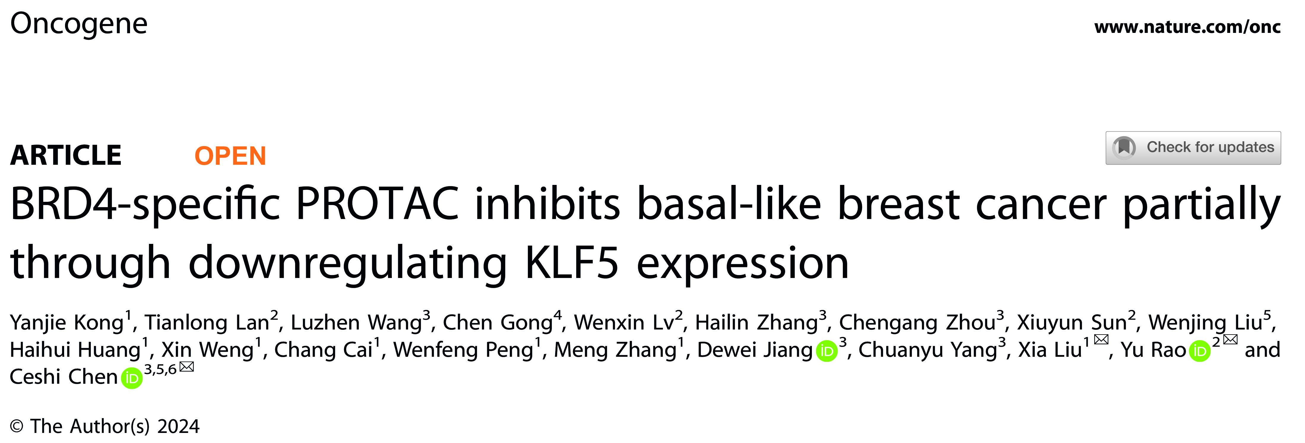 最近,Beat365唯一官方网站生物医学工程研究院、Beat365唯一官方网站第三附属医院陈策实院长团队与清华大学药学院饶燏教授团队合作,在国际癌症研究领域的《Oncogene》杂志发表题为“BRD4-speci?c PROTAC inhibits basal-like breast cancer partially through downregulating KLF5 expression”的研究论文。