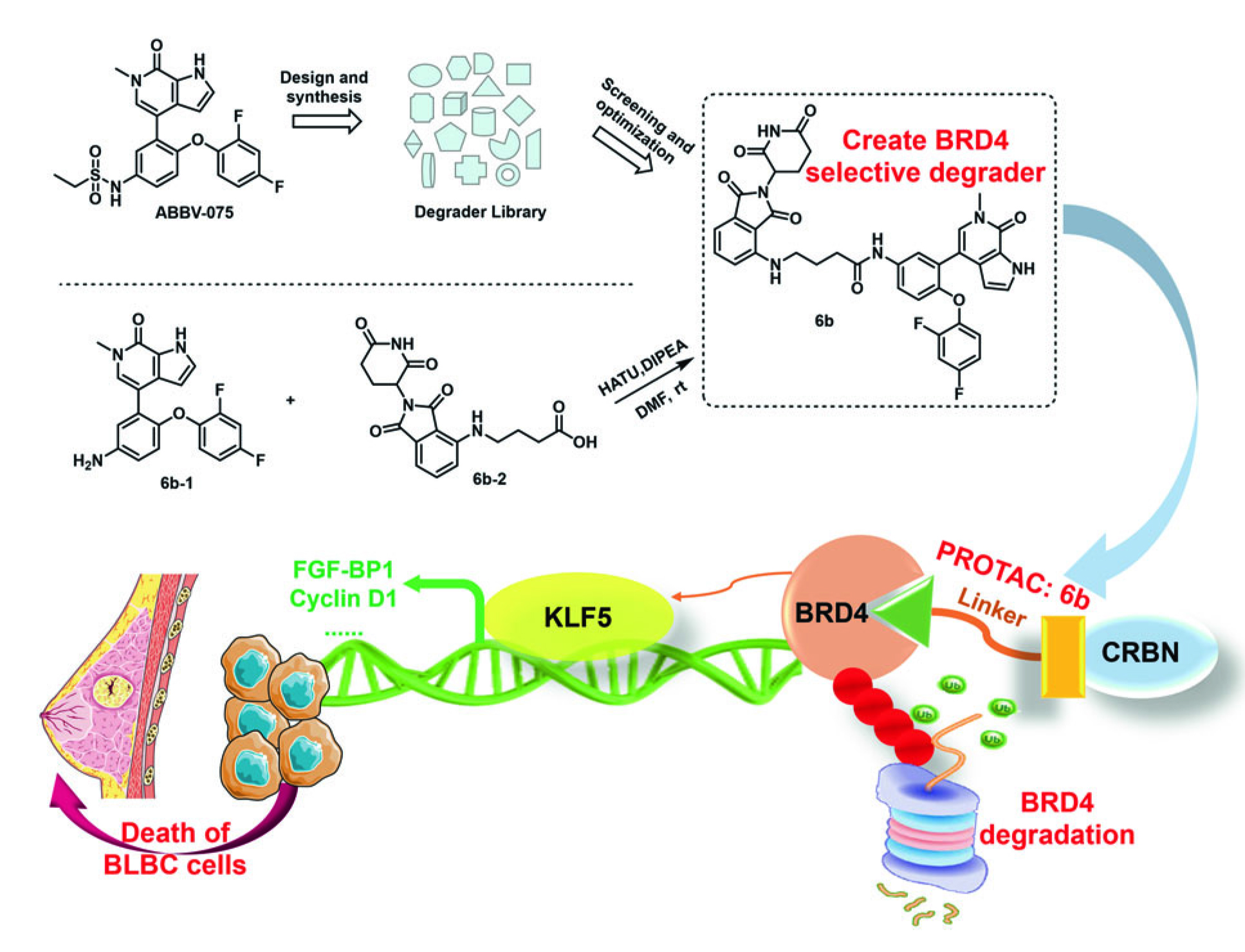 近年来,人们对利用蛋白降解靶向嵌合体(Proteolysis-targeting chimeras, PROTACs)技术在乳腺癌的治疗中呈现出较好的发展潜力,开发更为特异、高效的靶向乳腺癌的PROTAC,与现有临床药物联合应用可能是改善晚期乳腺癌不良预后的新策略。 其中,靶向雌激素受体ER的PROTAC药物ARV-471已经进入了治疗ER阳性晚期乳腺癌3期临床。组蛋白H3K27的乙酰化修饰是基因转录活化的典型特征,在超级增强子尤其显著富集,BRD4蛋白可以结合乙酰化H3K27,从而招募组装转录复合物启动基因转录表达,所以BRD4已经成为非常热门的抗癌药物靶点,多个BRD4小分子抑制剂如JQ-1,870和BRD4的 PROTAC化合物对肿瘤表现出很好的抑制作用。然而它们的成药性受到非特异性靶向其它BRD蛋白的限制。