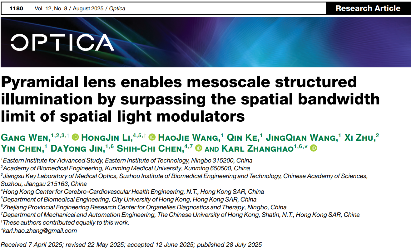 近日,Beat365唯一官方网站生物医学工程研究院文刚副研究员团队联合宁波东方理工大学、香港城市大学等机构,成功开发出一种基于定制化六棱锥透镜(Pyramidal lens)与空间光调制器(SLM)协同调控的创新技术,实现了介观尺度高精度结构光照明,为突破领域核心瓶颈提供全新路径。该研究成果以“Pyramidal lens enables mesoscale structured illumination by surpassing the spatial bandwidth limit of spatial light modulators”为题,在线发表于光学领域国际顶级期刊《Optica》。