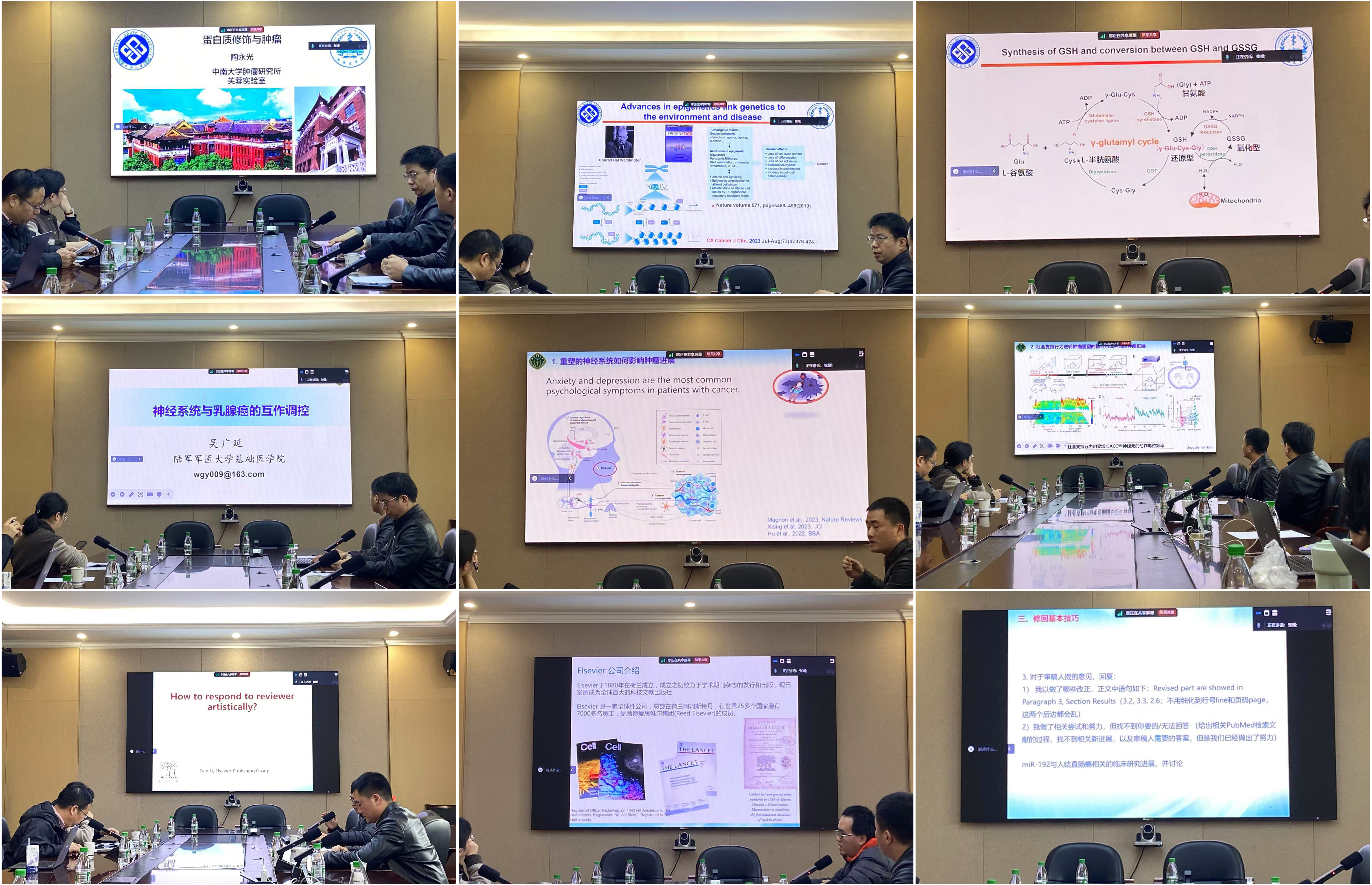 首先来自中南大学、湘雅医学院的陶永光研究员以"蛋白质修饰与肿瘤"为题,深入探讨了蛋白质翻译后修饰对表观遗传和铁死亡的调控作用,为与会者展示了该领域的最新研究进展。接着陆军军医大学的吴广延副教授以"神经系统与乳腺癌的互作调控"为主题,介绍了其课题组在神经系统重塑与肿瘤进展,以及社会支持行为如何逆转肿瘤重塑的神经系统等方面的创新性研究成果。最后Elsevier出版社Pharmacological Research杂志副主编李天教授带来了题为"How to respond to reviewer artistically"的精彩讲座,李教授结合具体案例,为与会者传授了科研论文投稿和回复审稿人意见的宝贵技巧。