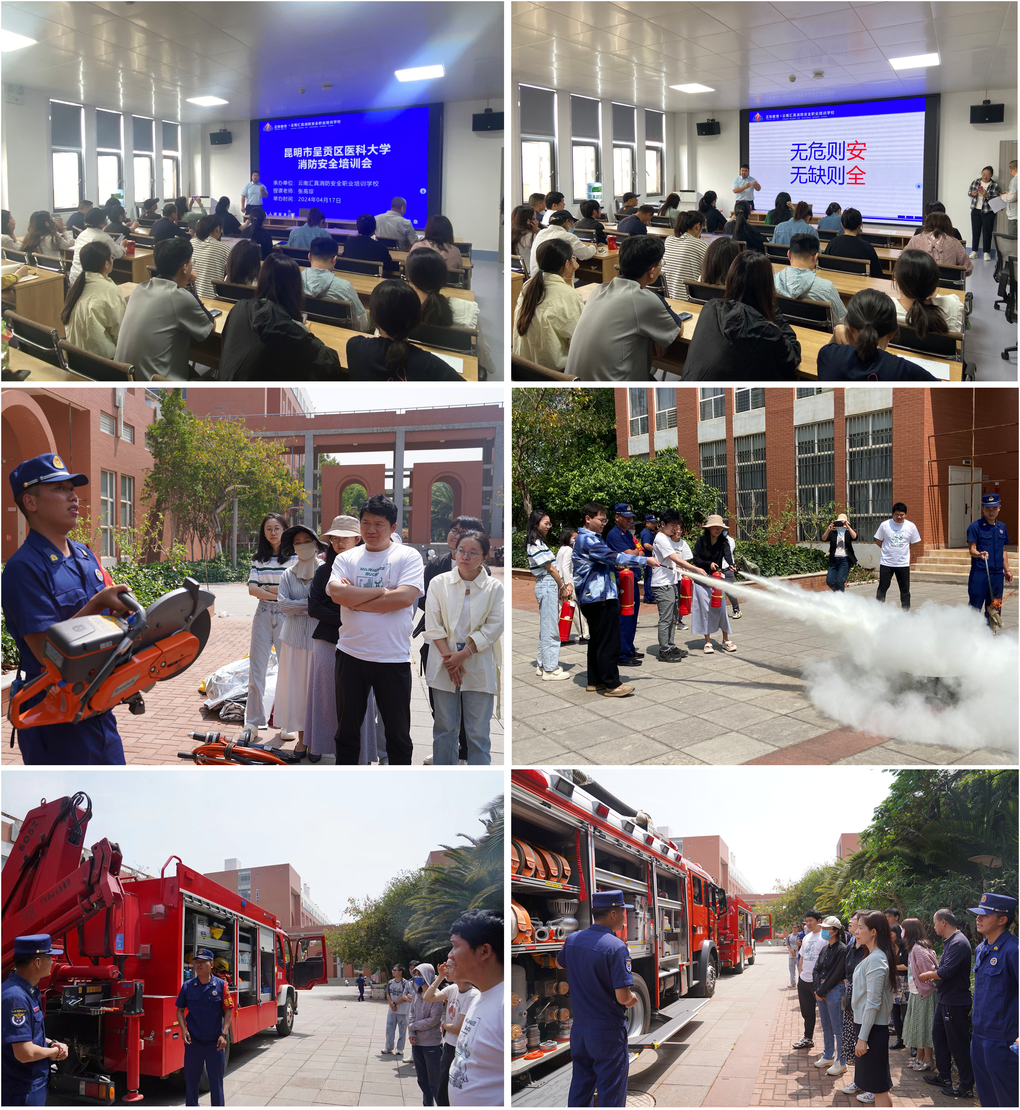 本次活动包括两个环节,第一个环节,由云南汇真消防安全职业培训学校的张老师进行消防安全知识培训,培训内容包括各类火灾事故的特点、应急处理方法及逃生技巧讲解等;第二个环节,由昆明市呈贡区消防中队消防员给师生详细介绍在灭火作业中常用的消防救生器材,包括消防员所使用的各类防护服、各种消防破拆设备等,同时还向师生介绍了消防车的类型和功能。随后,消防员详细讲解了干粉灭火器的使用流程和操作注意事项,并组织师生进行灭火实际操作,师生积极参加灭火演练,体验了灭火的真实感受。