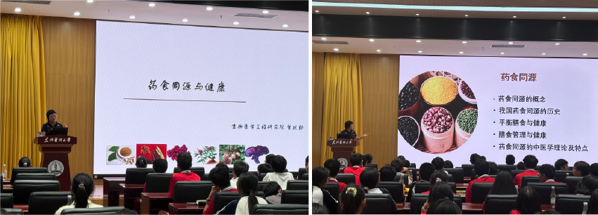 最后,师生们到图书馆4楼报告厅听取曾跃勤副教授开展的《药食同源与健康》学术讲座。曾教授从传统中医智慧出发,结合现代营养学知识,深入浅出地阐述了什么是药食同源,以及如何通过合理膳食促进健康。讲座内容丰富,生动有趣,赢得了师生们的热烈反响。