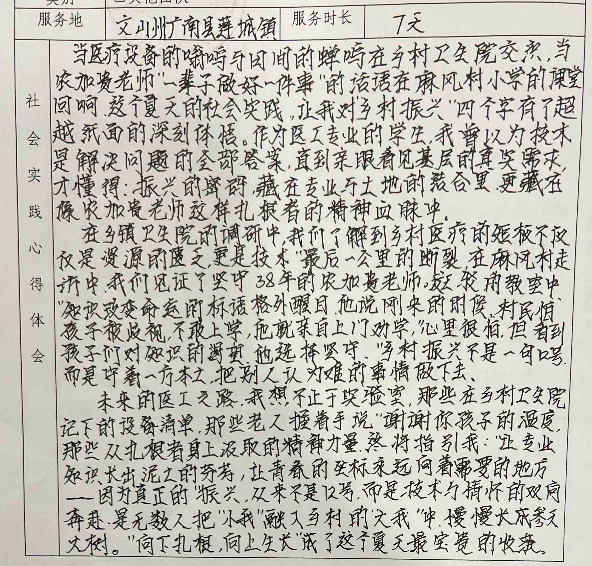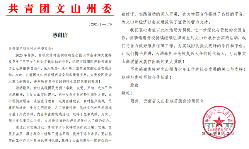 为期一周的实践,让同学们不仅触摸到真实的基层图景,更在一次次服务与对话中体会到“把论文写在大地上”的深刻含义。活动结束后,团队收到共青团文山州委发来的感谢信,信中对同学们“立足文山实际需求,发挥专业优势”的实践行动予以高度肯定。医工学子带去的是问卷与关怀,带回的是责任与敬意。广南之行,不仅是一次暑期实践,更是一堂深刻的人生必修课。