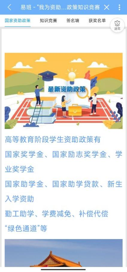 全校学生通过易班app进行线上答题,竞赛题目以“奖、助、贷、勤、补、减、免”以及“诚信”为切入点组成题库,学生随机抽取一套题目作答。根据学生线上竞赛答题时间和成绩,设一等奖5名,二等奖15名,三等奖30名。根据各学院学生线上参赛率和获奖情况,评选优秀组织奖4个。最终共计2000余名学生参加竞赛。