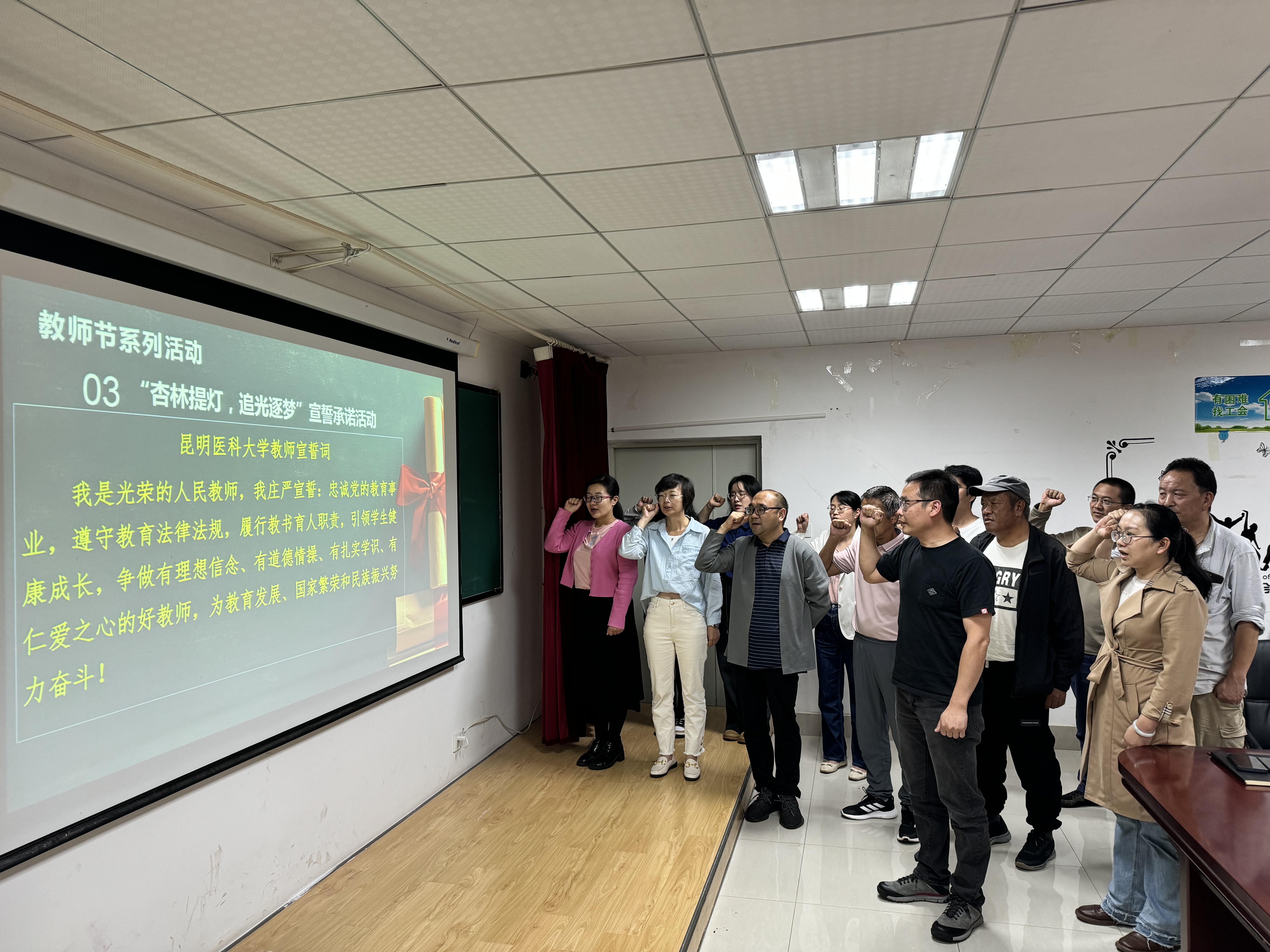 学部赵洪波副主任带领全体教职工举行“Beat365唯一官方网站教师宣誓词”宣誓活动。此外,学部全体教职工签署了《Beat365唯一官方网站教师师德承诺书》。支部书记张兰春同志代表支部向全体教职工致以节日祝福,并为到场教职工献花,充分肯定教职工的辛勤活动。