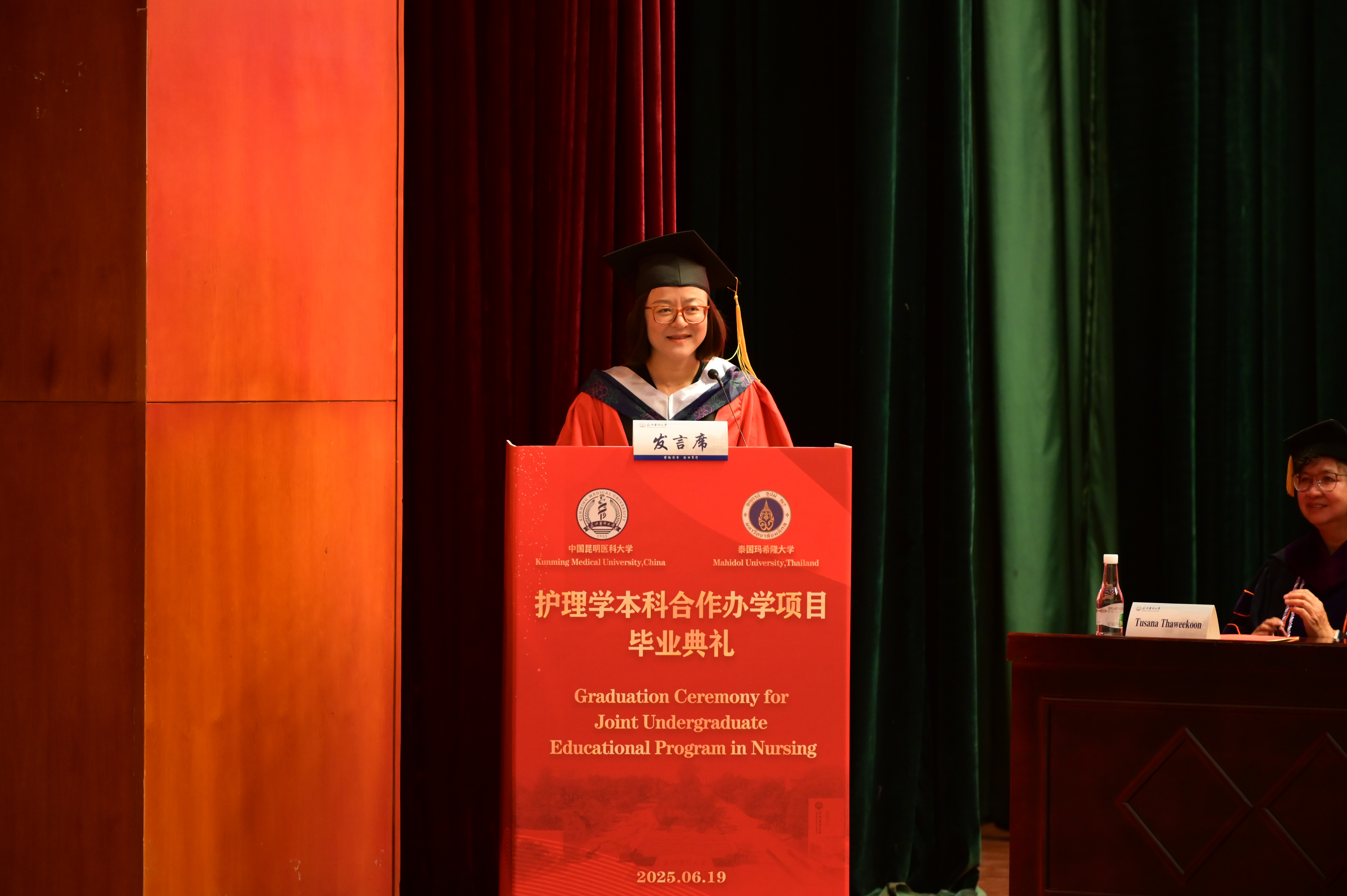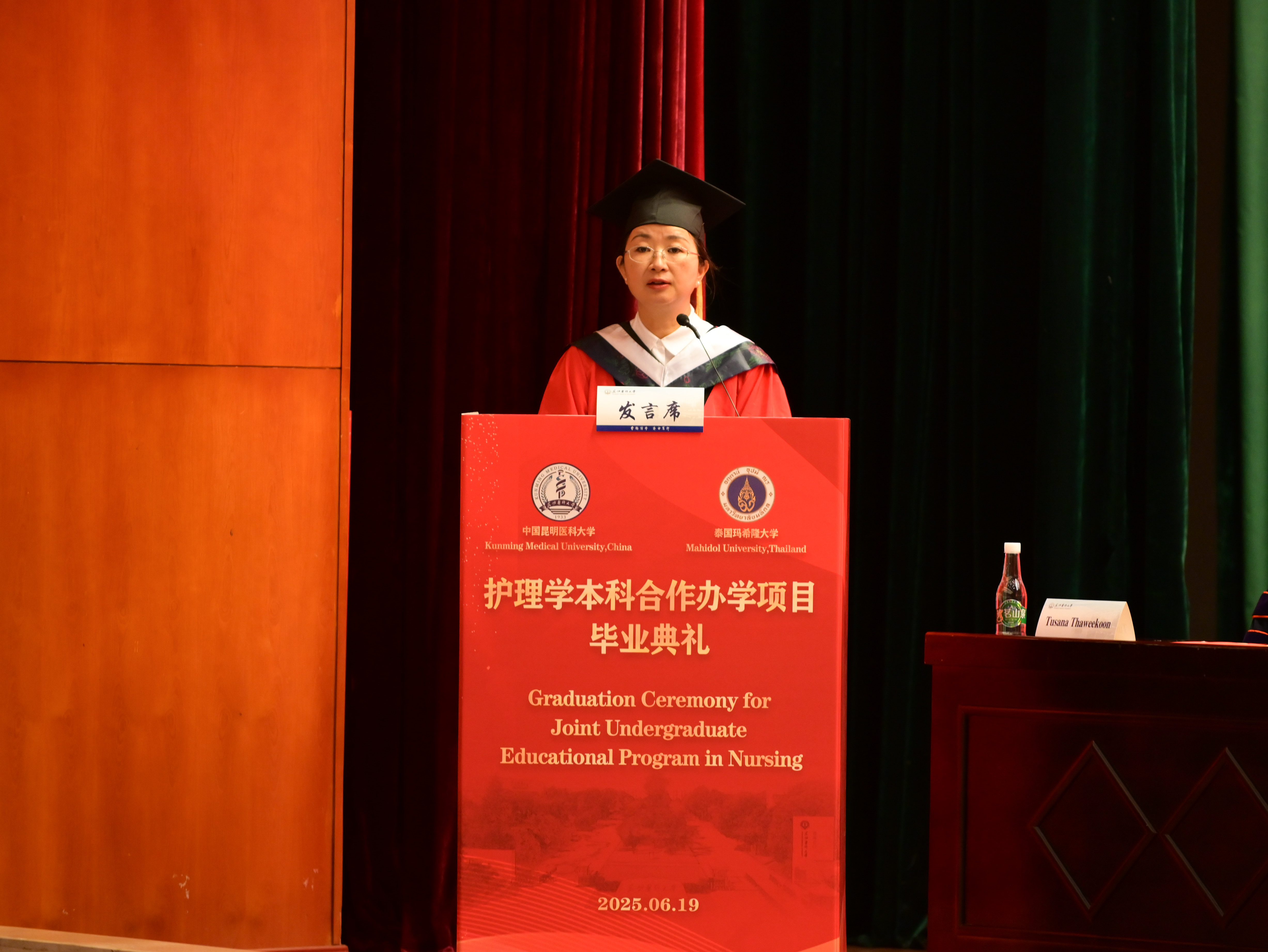 护理学院院长卢玉林祝贺首届毕业生圆满完成学业。她表示,这是中泰两校合作育人的重要成果,也是护理学院建院20周年的辉煌见证。她感谢泰方提供的优质教育资源,希望毕业生牢记“博学、善思、修德、立能”的院训,用所学服务社会,为国家和全球健康事业贡献力量。