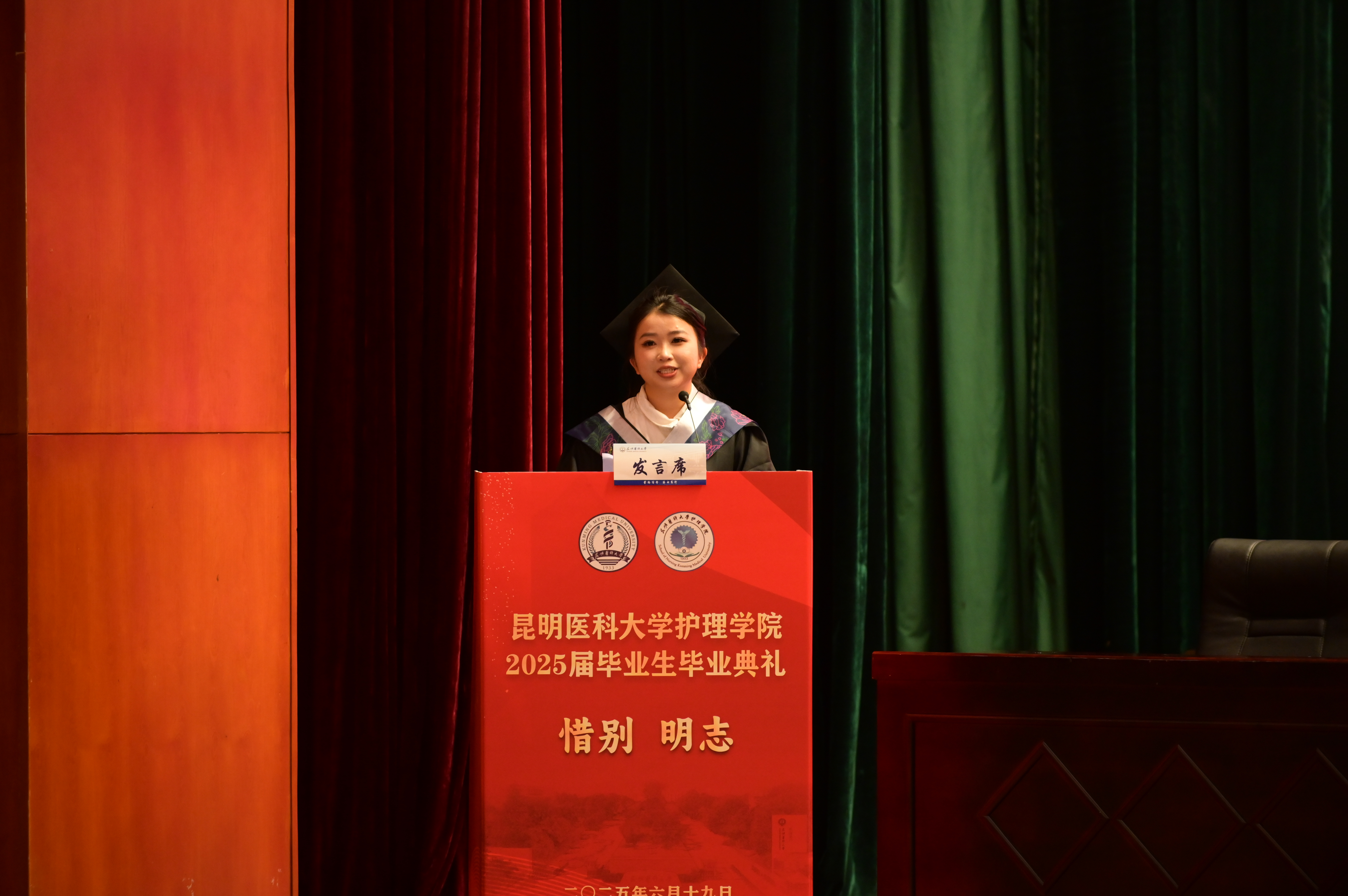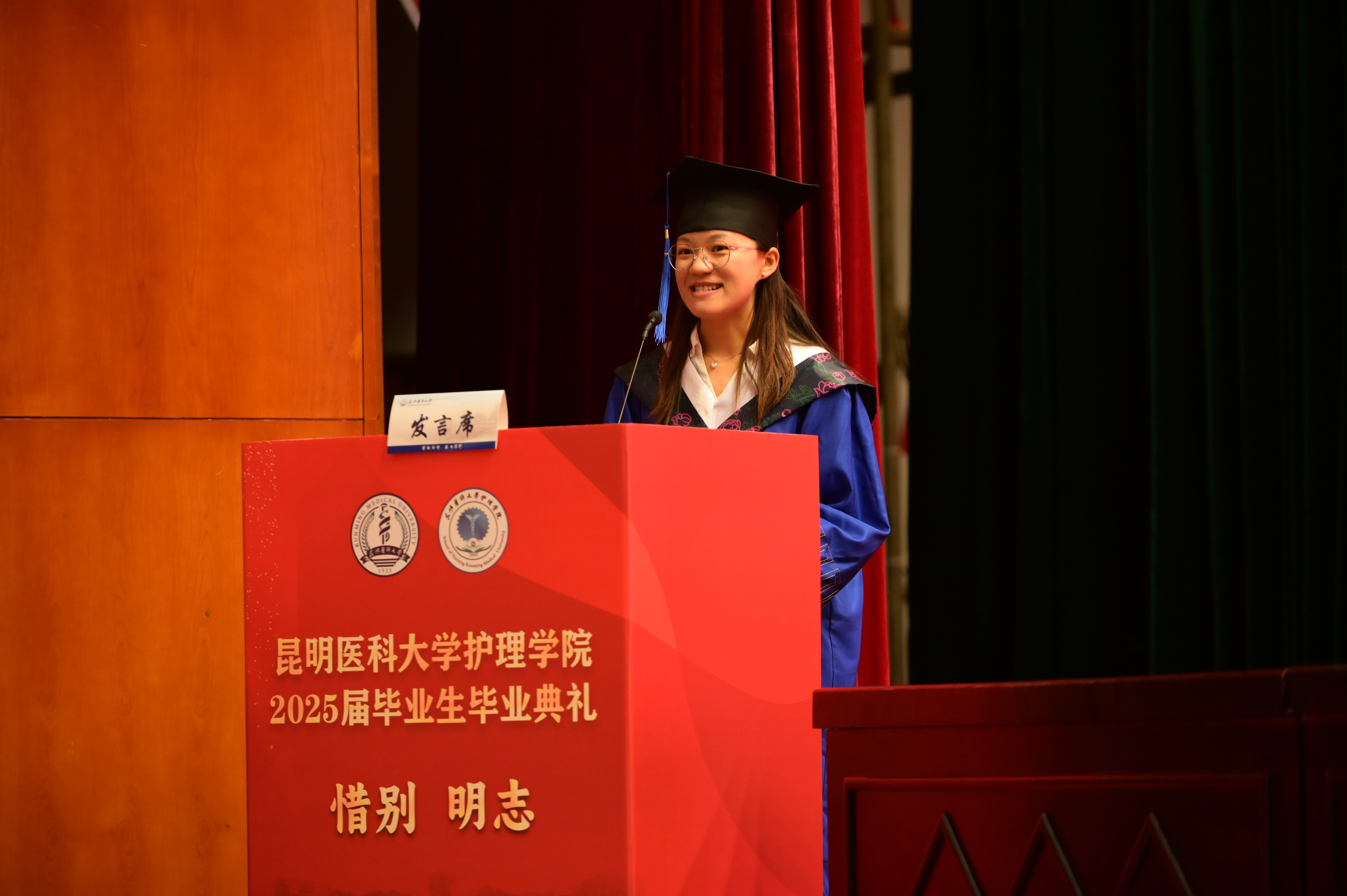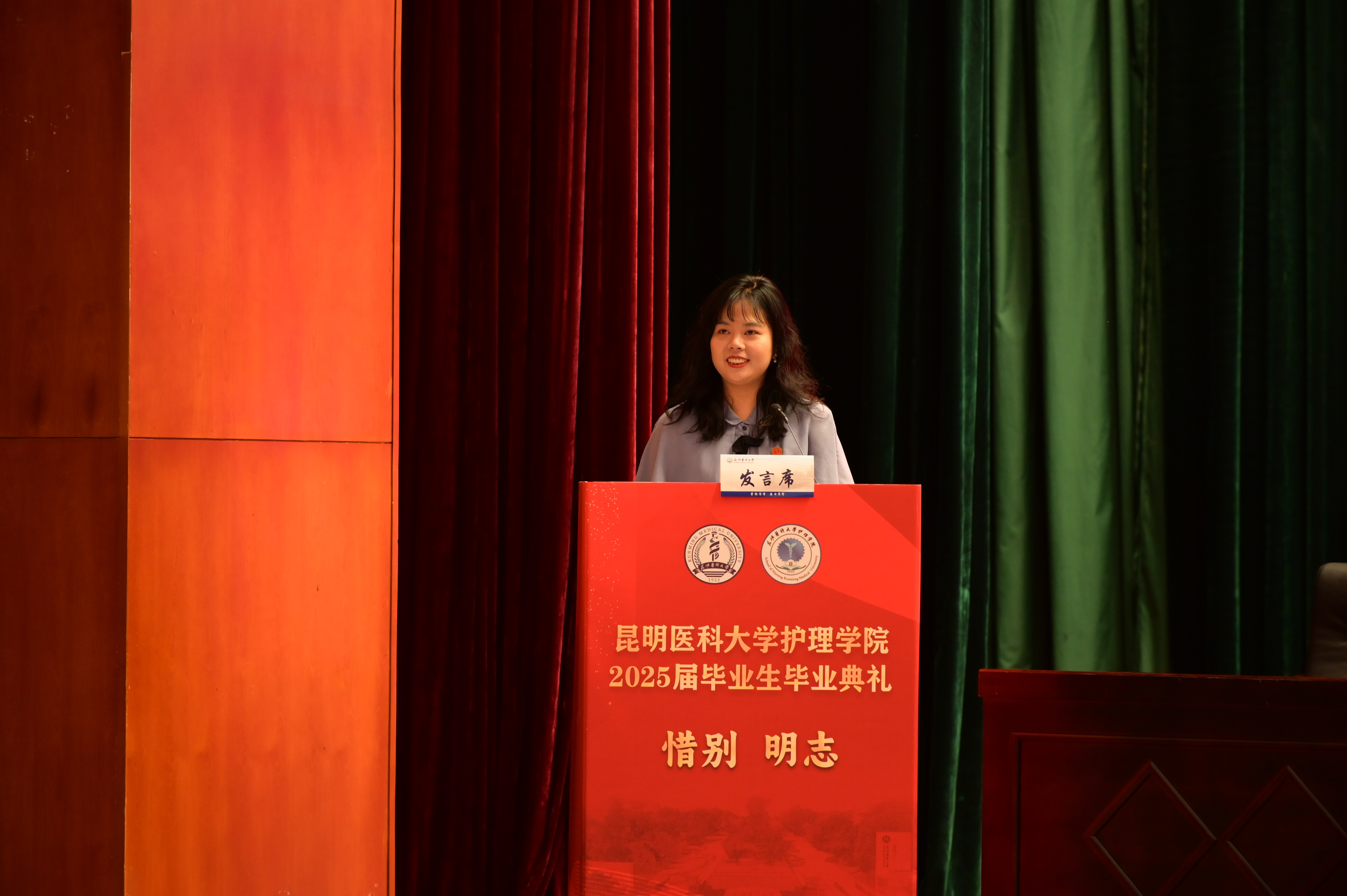 在毕业生代表发言环节,研究生代表朱青青和本科生代表樊雨虹先后发言。她们深情回顾了在护理学院的求学成长历程,表达了对母校悉心栽培、恩师谆谆教诲的深切感恩之情,并立志秉持南丁格尔精神,投身护理事业,服务人民健康。
