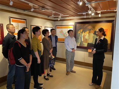 全体参加活动人员依次参观了旧址展馆上挂着的一幅幅油画和介绍,一张小木桌、一盏煤油灯,再现了当时第一次党员会议的情景。
