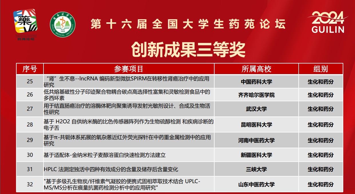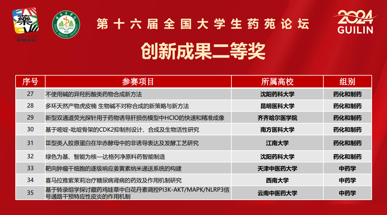 2024年11月23日至24日,第十六届全国大学生药苑论坛在桂林医学院举行。我院推荐的项目《多环天然产物虎皮楠生物碱不对称合成的新策略与新方法》(参赛学生:朱永杰、刘嘉敏、邓海霞、杨杜宇;指导老师:姚建能)和《基于H2O2自供纳米酶的比色传感器阵列作为生物硫醇检测和疾病诊断的电子舌》(参赛学生:郑婧婧、王焮、徐若萍、吴婷、王钰丹;指导老师:魏钰卜),分别荣获创新成果二等奖和三等奖。