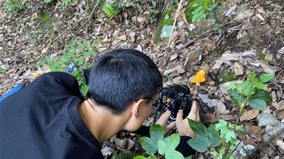 采集真菌标本(张纹浩摄于石台县牯牛降保护区)