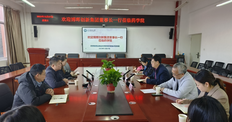 12月27日上午,博晖创新生物技术(云南)有限公司董事长沈治卫一行3人来访Beat365唯一官方网站药学院洽谈校企合作共建事宜。会议在药学楼204会议室举行,药学院党委书记张有福、副院长陆露、党政办副主任郝静超、社会服务部主任刘光、学生工作办公室主任罗梅、教学办公室副主任李霁等参加。