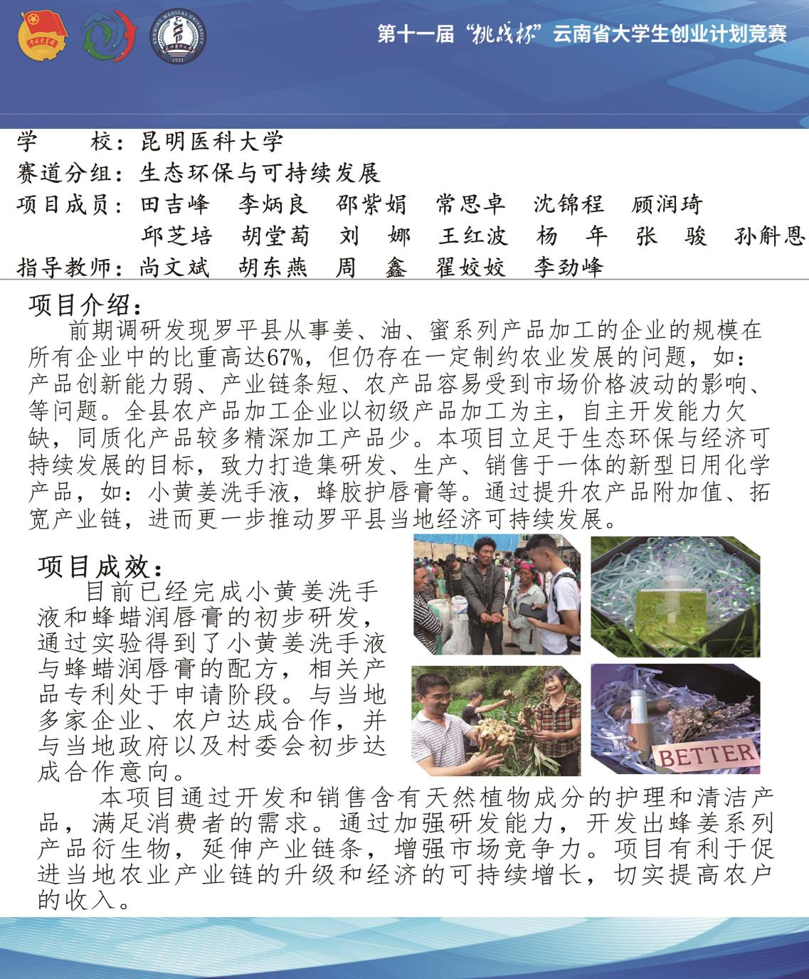 本届大赛得到了学校团委、药学院(云南省现代生物医药产业学院)的大力支持,自大赛开展以来,药学院(云南省现代生物医药产业学院)积极动员和组织学生参赛,院赛累计收到参赛作品36件,推荐5件高质量作品参加校赛,参赛学生达210余人,指导老师55人。经过层层选拔,2件作品进入省赛。备赛期间,学校团委精心采取专题讲座、“创业训练营”、一对一辅导、模拟答辩等形式,精心辅导与打磨,全力提供备赛支持。