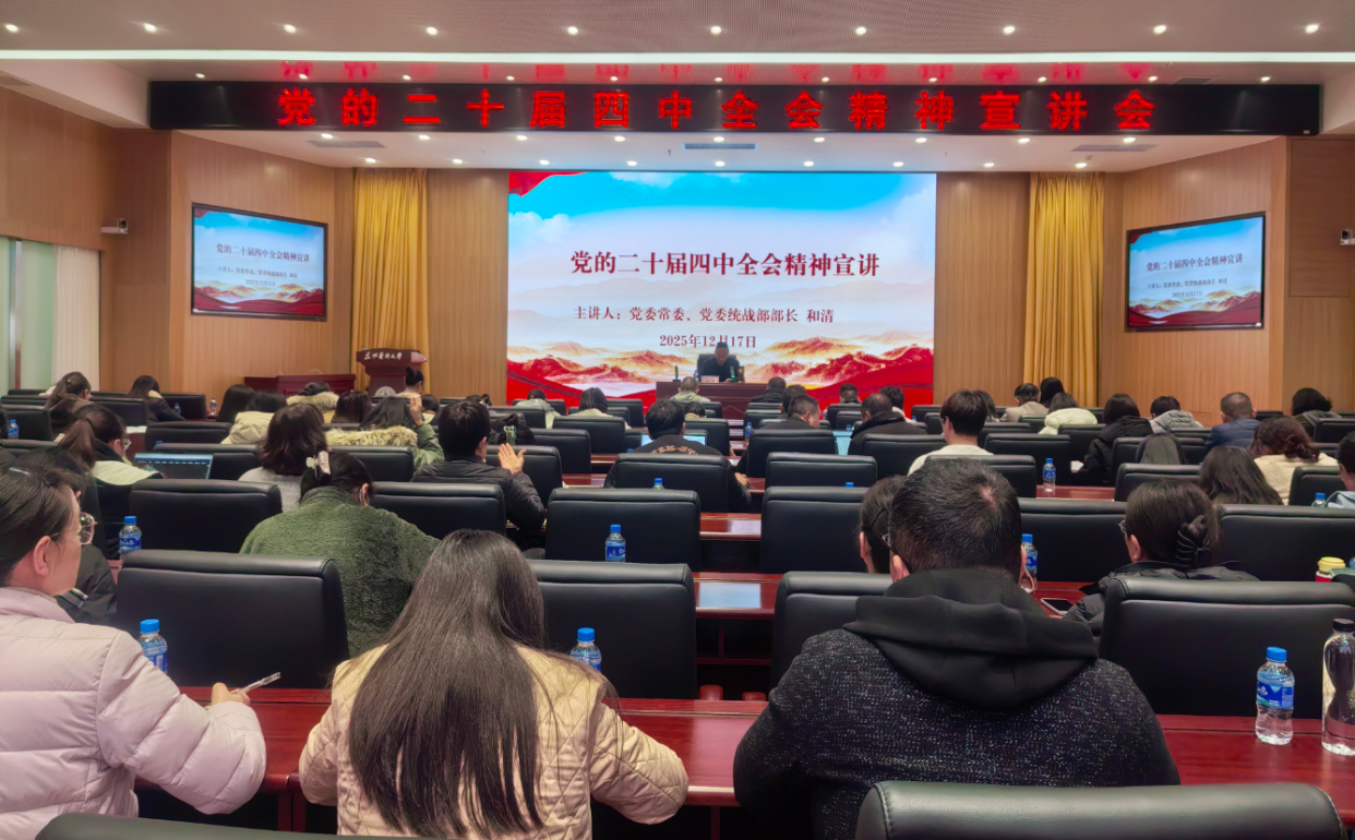 12月17日下午,直属单位党委在图书馆四楼报告厅举办党的二十届四中全会精神宣讲报告会,邀请学校党委常委、党委统战部部长和清作专题宣讲,直属单位党委委员、直属各单位党员干部、民主党派成员、无党派人士、党外知识分子和少数民族师生代表共计115人参加,会议由直属单位党委书记罗勇前主持。
