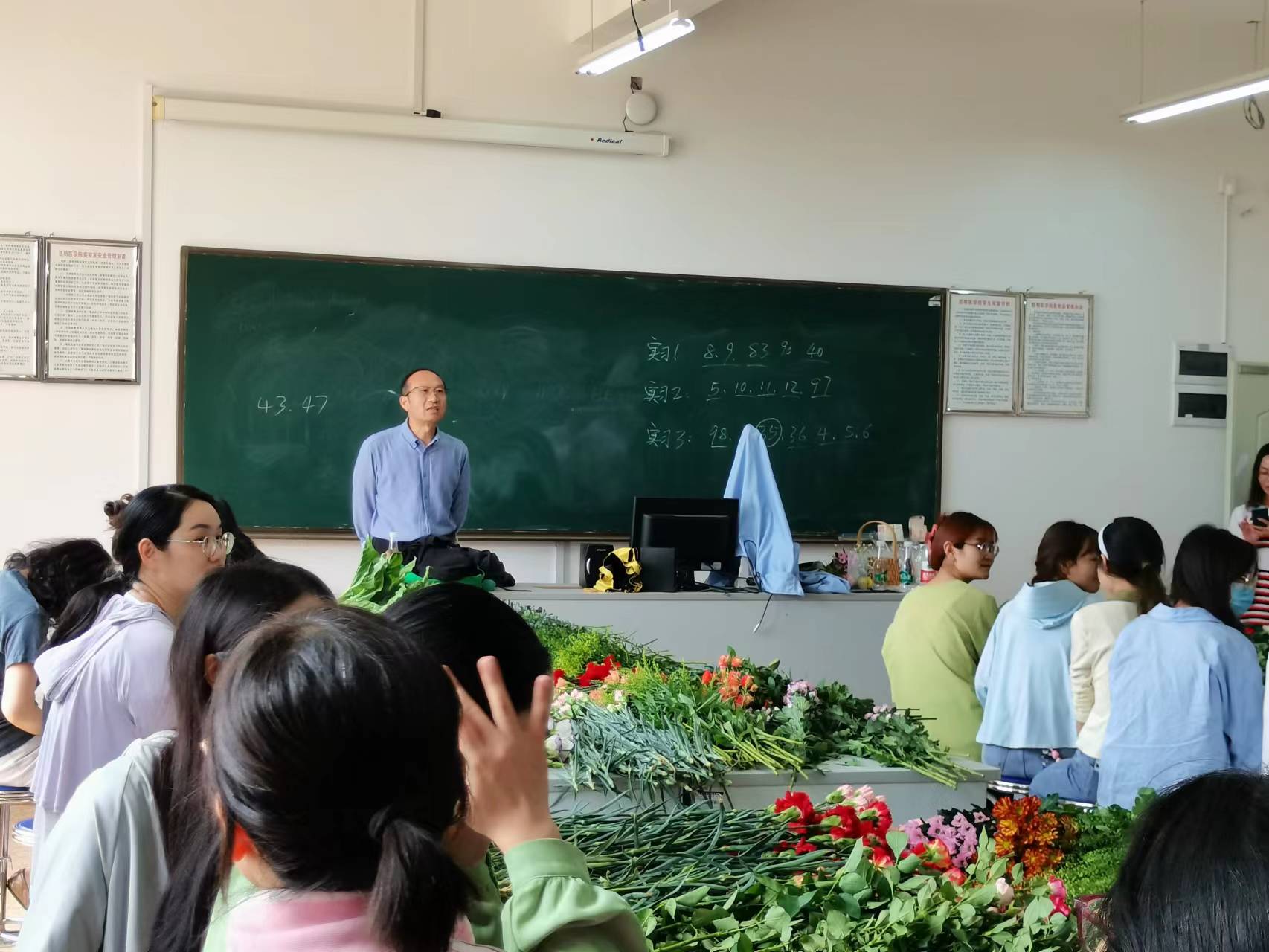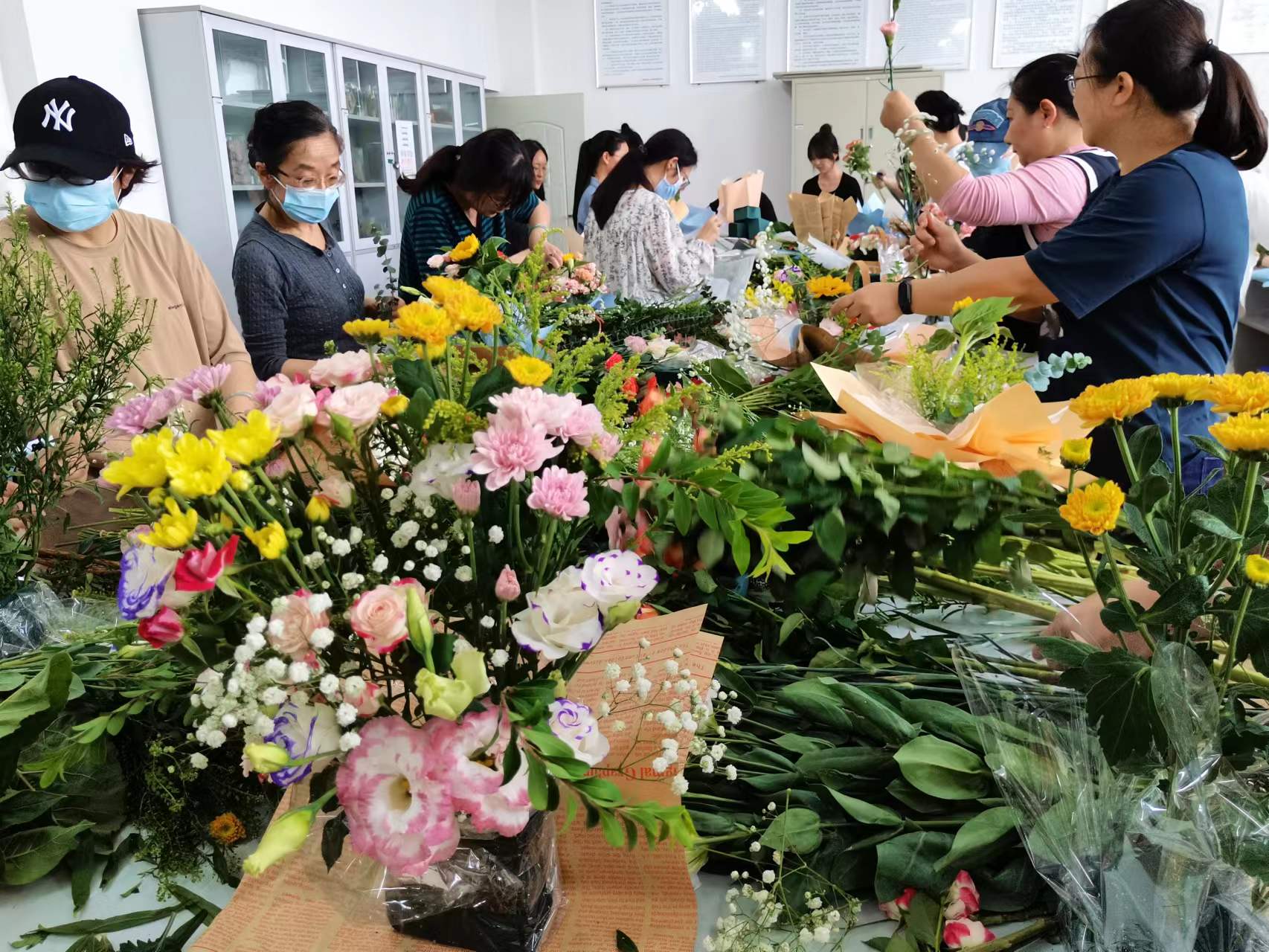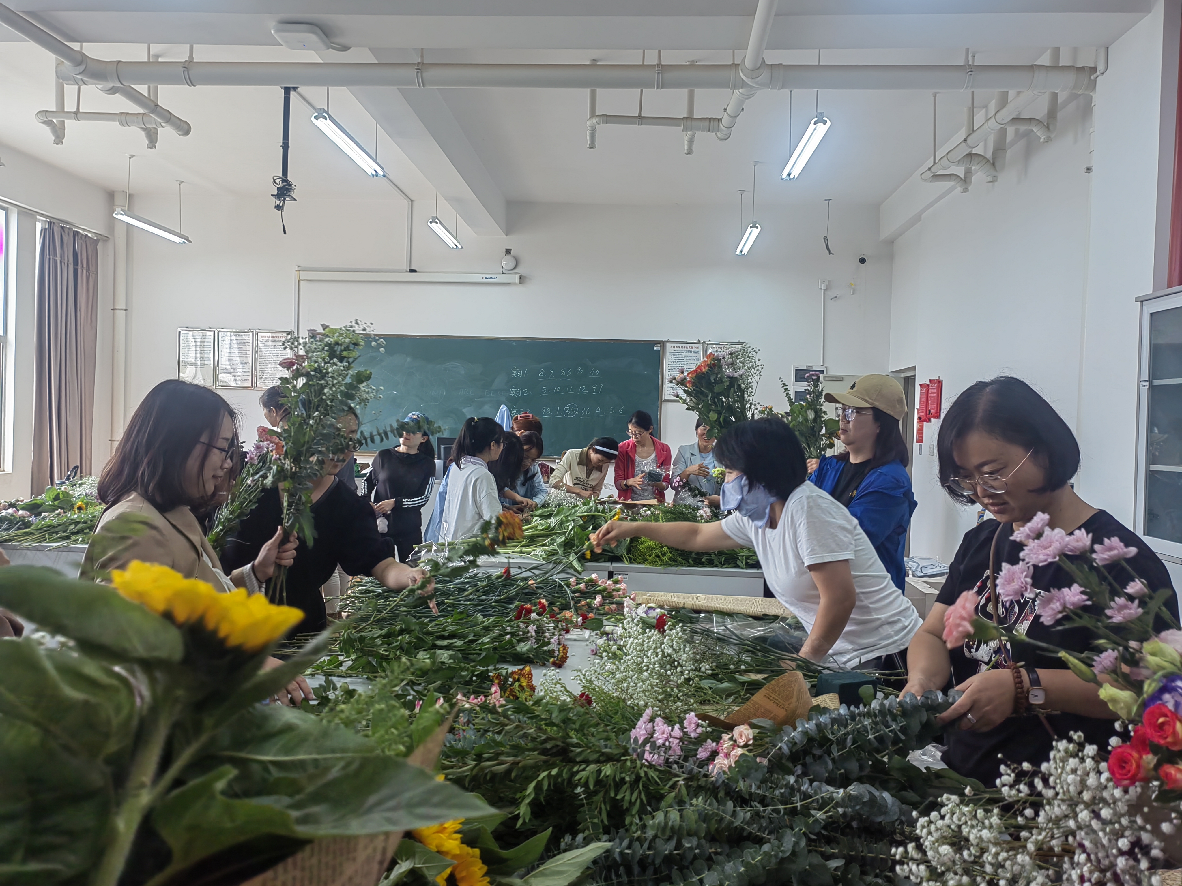 本次活动主要围绕制作花束和花篮开展,希望通过插花制作,让师生们借花香亲近自然,学花艺陶冶心情。活动特邀杨学芳老师进行指导,她对花材品种、花语、插花技巧进行了讲解,并进行个别指导。活动现场花香四溢,师生们沟通交流、互相切磋,认真取材、剪叶、构思,大选身手,亲手制作出赏心悦目的插花作品,气氛热烈而温馨。