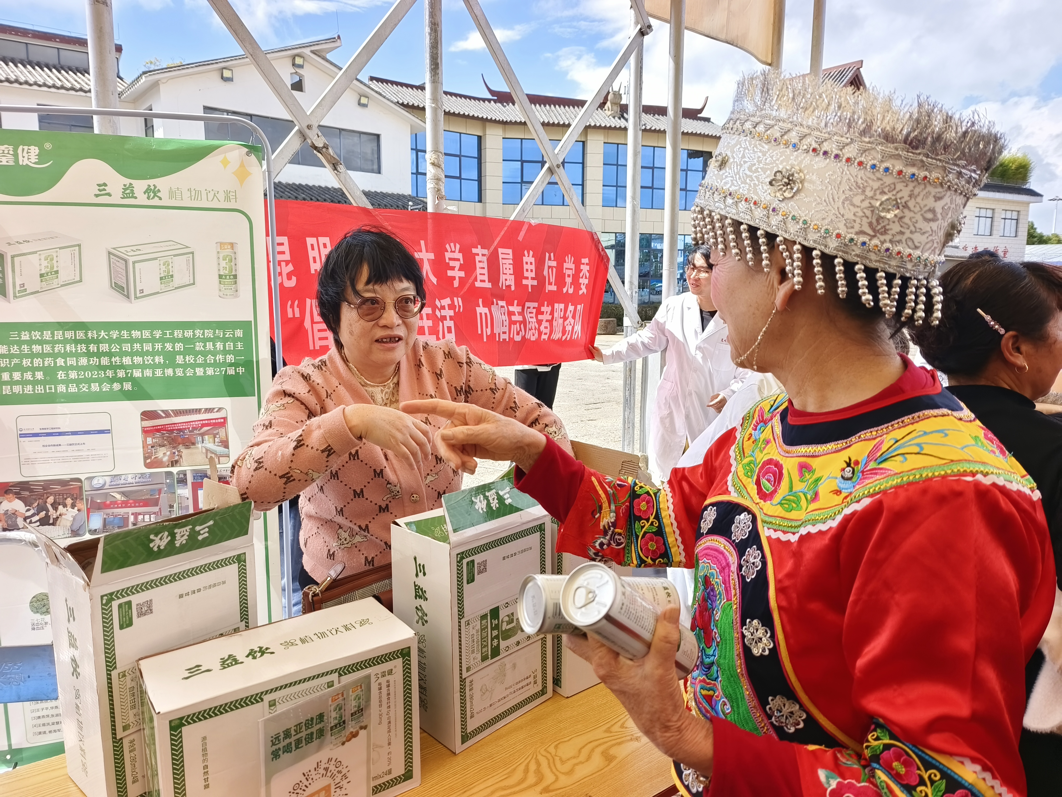 一支服务队由生物医学工程研究院曾跃勤副教授带队,免费发放植物饮料三益饮600瓶,给社区老人送健康送温暖。