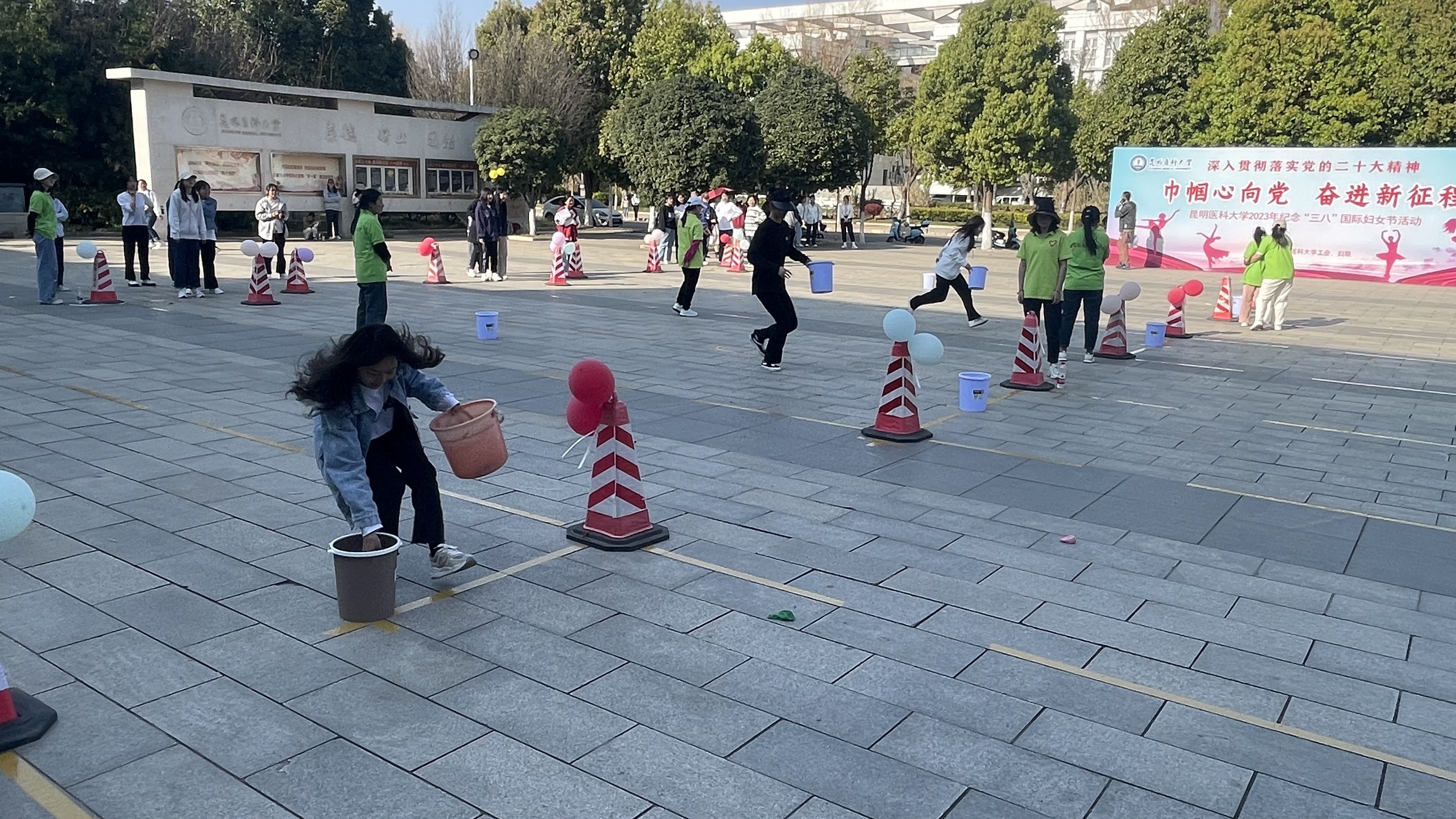 呈贡校区开展了女同胞的趣味活动,“铺地砖”“抢种抢收”“滚铁圈”“踩气球”等集体项目精彩纷呈,各部门负责人带头参与活动,女职工们踊跃参与,男职工们积极配合,第一次参加活动的女同学们热情高涨,学校“锦鲤啦啦队”带来了“巾帼展宏图,九州春意浓”啦啦操表演,活动现场气氛热烈。各部门工会还开展了“投箭如壶”“鱼戏珠鲤”“跳房子”“筷子夹乒乓球”“蒙眼互打”等别出心裁的个人项目,女同胞们共同度过了一个欢乐祥和的节日。