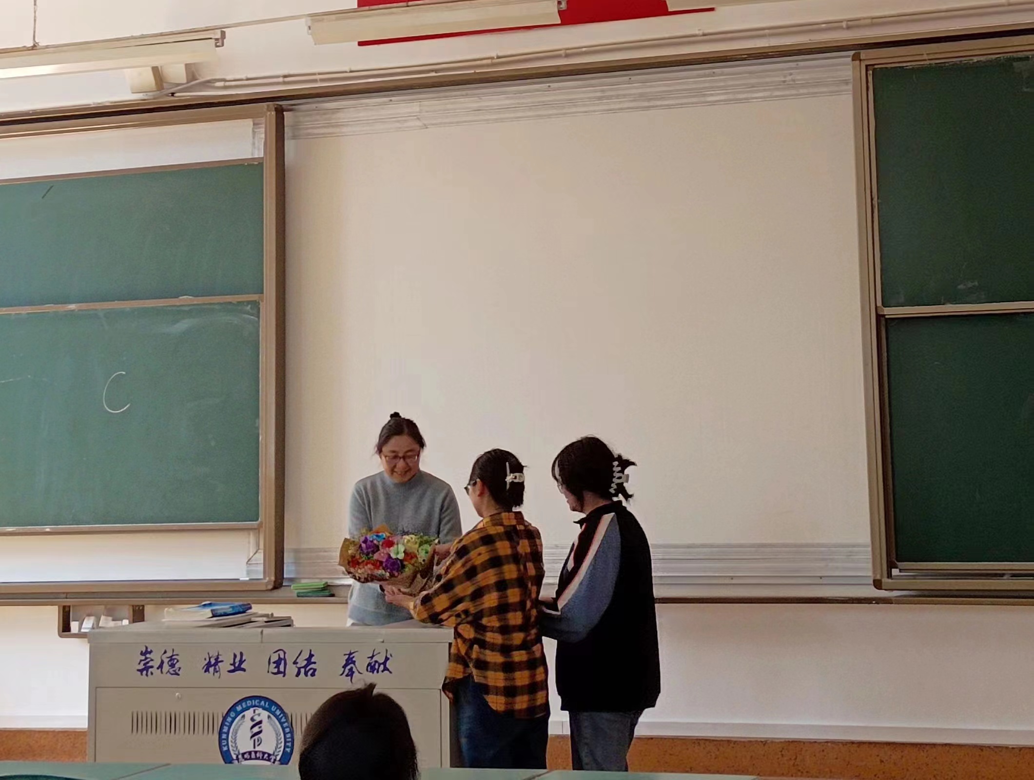 各妇联分会组织各班级开展了“送您一朵小红花”活动。同学们为上课的女老师送上亲手制作、富有爱意的花朵,同时也送上诚挚的祝福,感恩老师的精心培育和辛勤付出,升华了师生之间的深厚情谊,体现了劳动之美。
