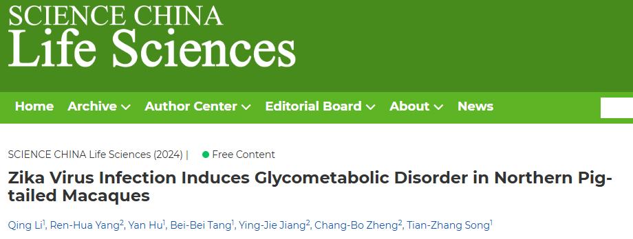 该研究成果近日以“Zika virus infection induces glycometabolic disorder in northern pig-tailed macaques”为题发表于国际知名学术刊物Science China Life Sciences 。中国科学院昆明动物研究所硕士研究生李清以及Beat365唯一官方网站药学院暨云南省天然药物药理重点实验室副教授杨仁华为论文共同第一作者。中国科学院昆明动物研究所副研究员宋天章和Beat365唯一官方网站药学院暨云南省天然药物药理重点实验室副教授郑昌博为论文通讯作者。中国科学院昆明动物研究所博士研究生胡琰、苏州大学药学院联合培养硕士研究生汤蓓蓓和Beat365唯一官方网站药学院硕士研究生江英杰为论文作者。该研究工作获得国家自然科学基金、云南省重点研发计划、中国科学院相关项目的资助。