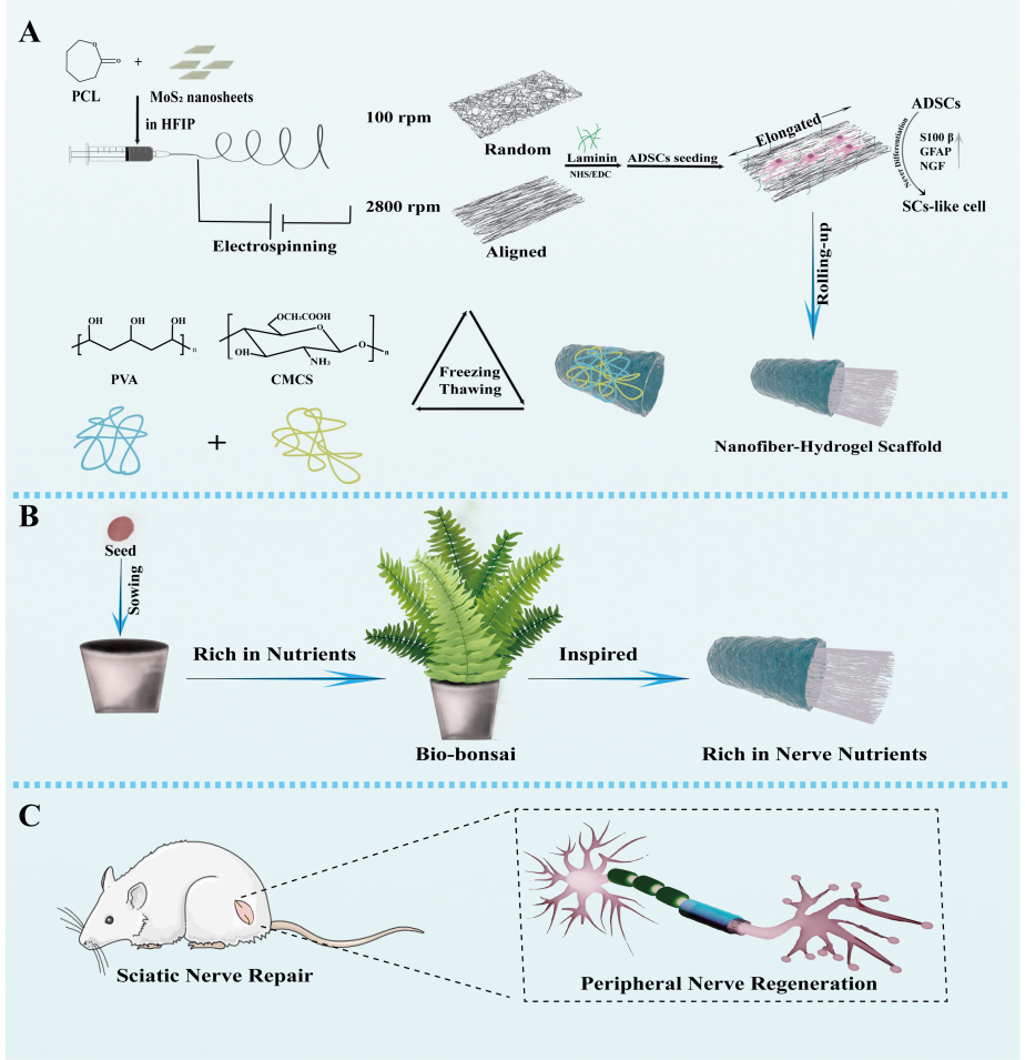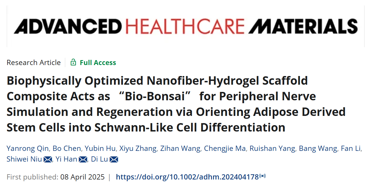 Qin Y,Chen B,Hu Y,Zhang X,Wang Z,Ma C,Yang R,Wang B,Li F,Niu S,Han Y,Lu D.Biophysically Optimized Nanofiber-Hydrogel Scaffold Composite Acts as "Bio-Bonsai" for Peripheral Nerve Simulation and Regeneration via Orienting Adipose Derived Stem Cells into Schwann-Like Cell Differentiation.Adv. Healthc. Mater. 2025 Apr 8: e2404178.