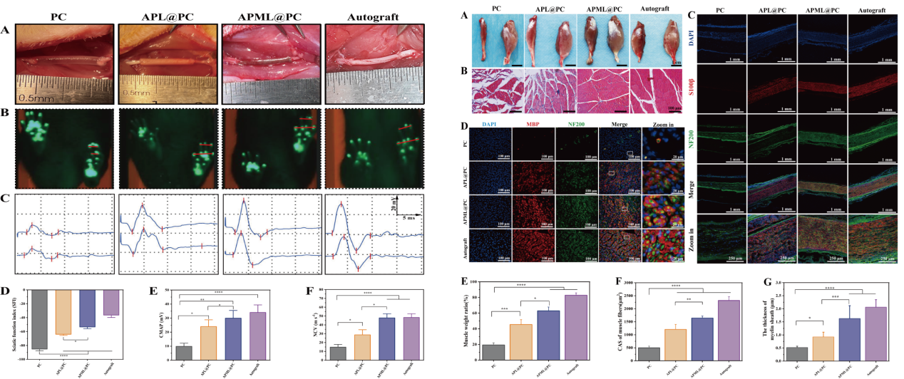 经体内外实验证实APML@PC具有良好的生物相容性和合理的生物降解行为,并具有促进轴突生长、髓鞘再生和神经功能恢复的能力。该研究为干细胞治疗周围神经再生提供了一个新的视角,从而为临床有效治疗PNI开辟了新的途径。
