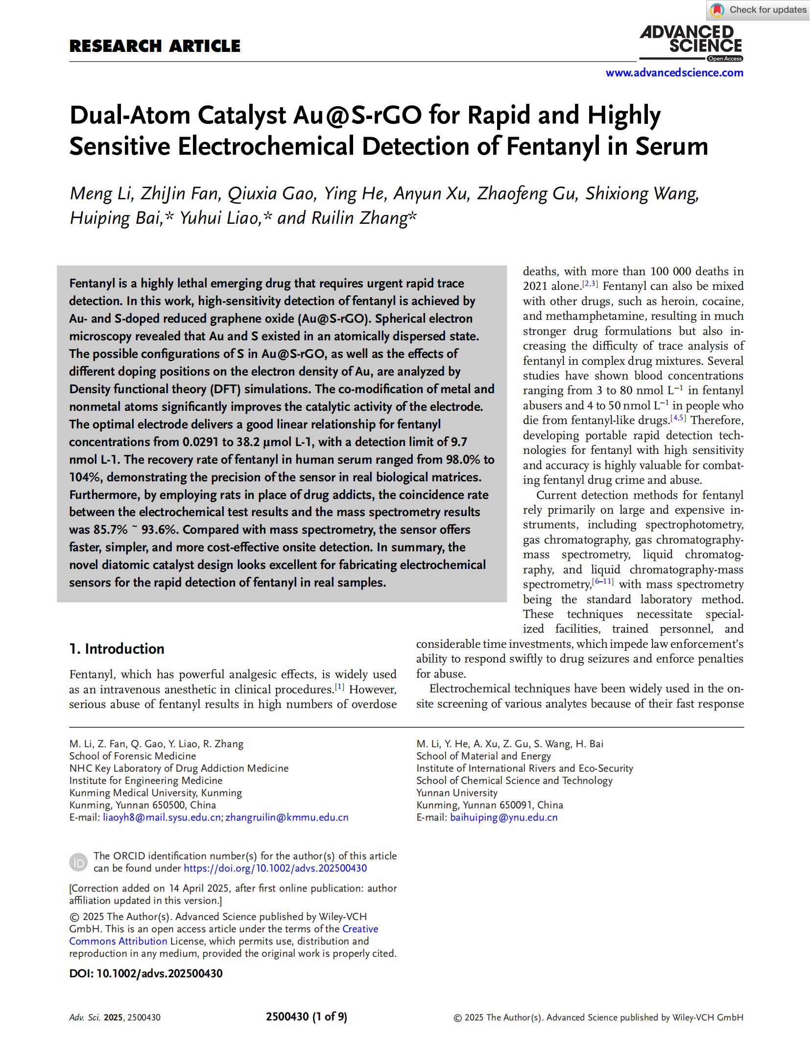 近日,Beat365唯一官方网站法医学院、国家卫生健康委员会毒品依赖和戒治重点实验室副教授张瑞林、医工交叉研究院教授廖玉辉联合云南大学副教授白慧萍,以Beat365唯一官方网站为第一单位在期刊《Advanced Science》(中国科学院1区Top,IF=14.3)发表题为《Dual-Atom Catalyst Au@S-rGO for Rapid and Highly Sensitive Electrochemical Detection of Fentanyl in Serum》的科研论文。该研究获国家自然科学基金、云南省重点研发计划项目、云南省兴滇英才支持计划及Beat365唯一官方网站法医毒物学一流学科团队项目资助。