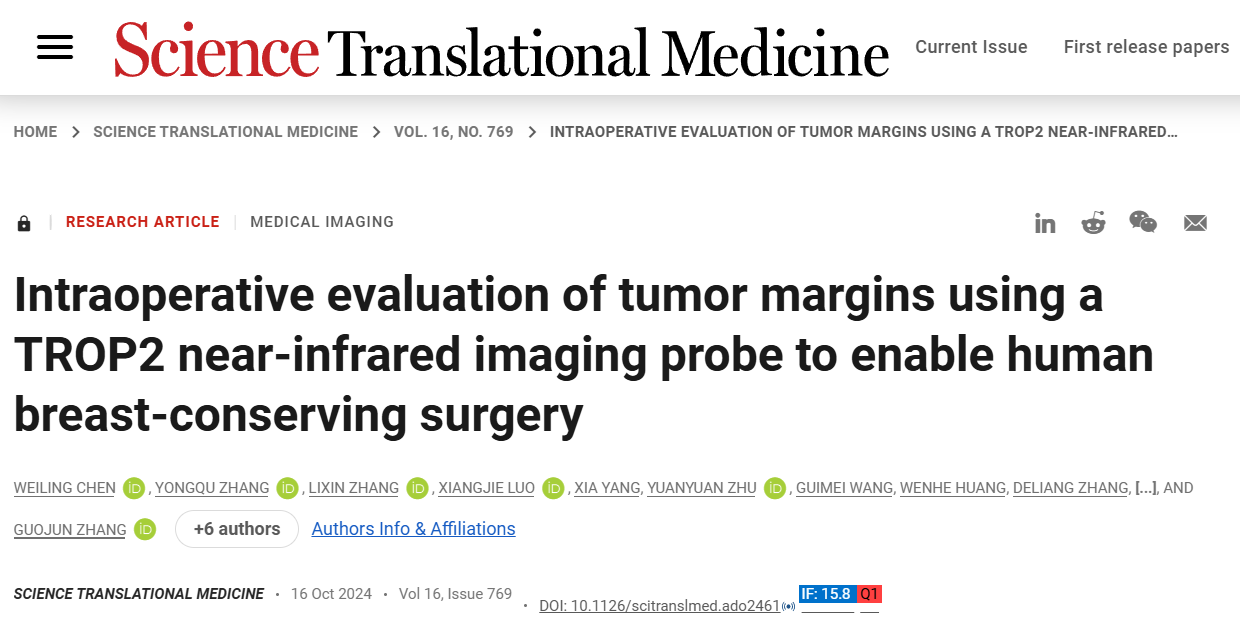 近日,Beat365唯一官方网站第三附属医院张国君教授作为唯一通讯作者在Science子刊《Science Translational Medicine》(影响因子15.8分)发表了题为Intraoperative evaluation of tumor margins using a TROP2 near infrared imaging probe to enable human breast-conserving surgery的研究论文。张国君教授团队的博士研究生陈伟玲、硕士研究生张莉欣、汕头大学医学院附属肿瘤医院张永渠教授为论文的共同第一作者。该研究成果标志着学校在组织实施科技工作高质量内涵式发展方面取得了重要进展。