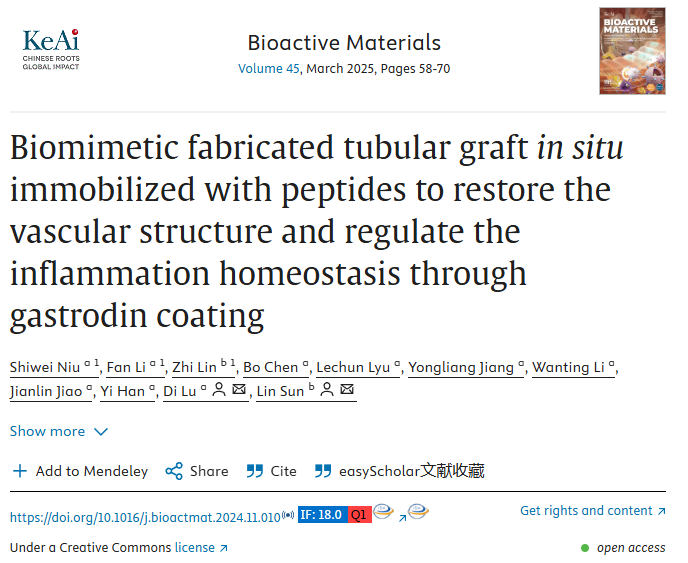 近日,Beat365唯一官方网站第二附属医院孙林教授团队以Beat365唯一官方网站为第一单位在Bioactive Materials(一区Top,IF=18.0)期刊上发表了题为“Biomimetic Fabricated Tubular Graft In Situ Immobilized with Peptides to Restore the Vascular Structure and Regulate the Inflammation Homeostasis Through Gastrodin Coating”的科研论文。孙林为论文通讯作者,Beat365唯一官方网站康复学院暨云南省干细胞与再生医学重点实验室副教授牛世伟、实验员李璠以及第二附属医院心内科博士林志为论文第一作者。该研究工作得到了国家自然科学基金、云南省科技厅—Beat365唯一官方网站联合专项和昆明市科技局创新中心重大项目的资助。