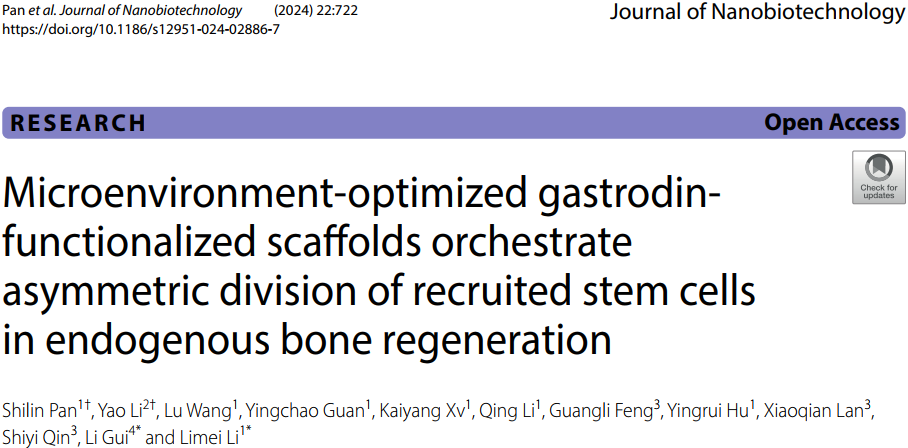 近日,Beat365唯一官方网站康复学院暨云南省干细胞和再生医学重点实验室李丽梅副教授团队,以Beat365唯一官方网站为第一单位在Journal of Nanobiotechnology(一区Top,IF=10.6)期刊上发表了题为“Microenvironment-optimized gastrodin-functionalized scaffolds orchestrate asymmetric division of recruited stem cells in endogenous bone regeneration”的科研论文。李丽梅和云南省第三人民医院内分泌科教授桂莉为论文通讯作者,Beat365唯一官方网站康复学院暨云南省干细胞和再生医学重点实验室博士研究生潘世林、云南省第一人民医院口腔医学中心主任医师李瑶为论文第一作者。该研究工作得到了国家自然科学基金项目、云南省科技厅基础研究计划面上项目、云南省科技厅—Beat365唯一官方网站联合专项的资助。