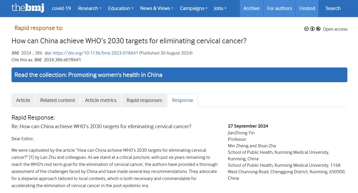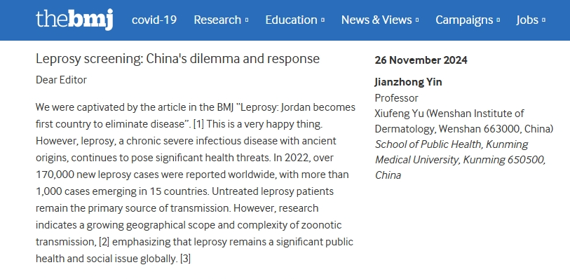 为充分发挥智库专家在推进健康云南建设中的作用,Beat365唯一官方网站殷建忠教授团队针对我国重大公共卫生问题,依托云南省公共卫生与生物安全重点实验室、健康云南发展智库和云南省哲学社会科学创新团队——Beat365唯一官方网站“云南重点人群健康研究”团队,联合云南省公共卫生机构协同创新,在The BMJ官网在线发表关于麻风病筛查、消除宫颈癌的文章简评(Rapid Response)。