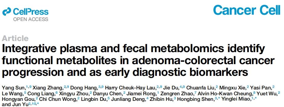 近日,Beat365唯一官方网站第一附属医院孙杨、缪应雷教授团队联合香港中文大学于君教授团队、南京医科大学沈洪兵院士团队、上海百趣代谢组学技术研究中心杜杰研究员团队,以学校为第一单位在国际顶级期刊《Cancer Cell》(IF=48.8)上发表了题为《Integrative plasma and fecal metabolomics identify functional metabolites in adenoma-colorectal cancer progression and as early diagnostic biomarkers》的论文,并被选为该期封面文章。实现学校在三大科技期刊(Cell、Nature、Science)之一Cell的大子刊上发表重要研究成果的再次突破,标志着学校在科技创新赋能高质量发展方面取得新成效。