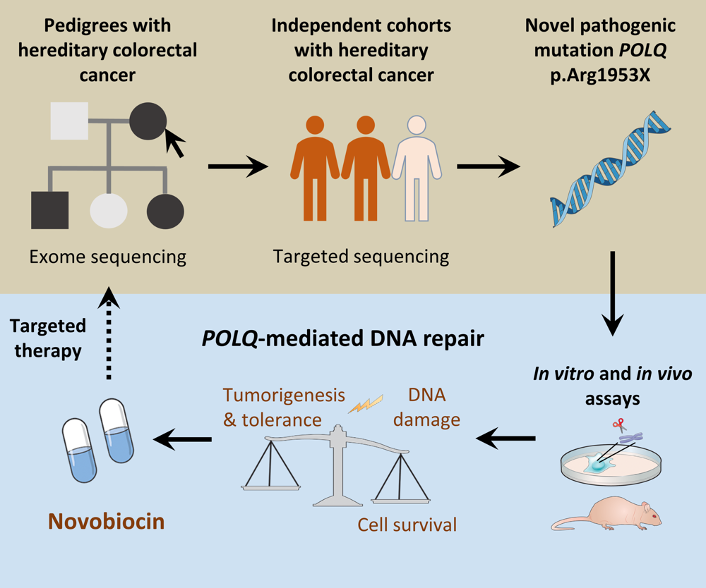 该研究通过对云南地区12个结直肠癌家系的全外显子测序,发现并验证了POLQ基因的p.Arg1953X突变在多个家族中与疾病表型高度共分离。随后,在84个家系性结直肠癌患者和285例早发、多发息肉或家族史患者的扩展队列中进一步筛查,确认了POLQ突变在约3%的家系中存在。功能学研究表明,该突变导致θ介导的末端连接(TMEJ)DNA修复途径异常激活,显著增加基因组不稳定性与突变负荷,从而促进肿瘤发生。