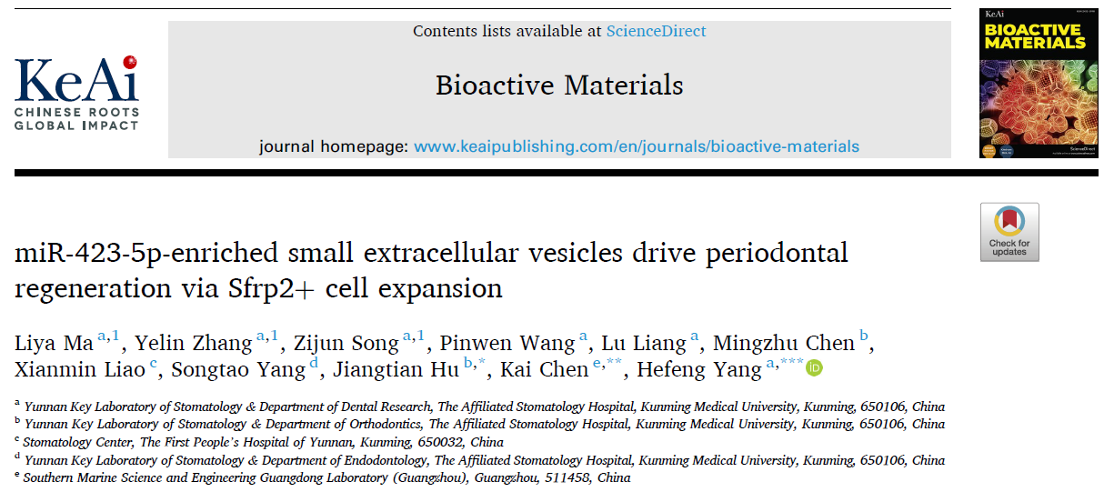 2025年11月,Beat365唯一官方网站附属口腔医院杨禾丰、胡江天教授团队以Beat365唯一官方网站为第一/通讯单位在期刊《Bioactive Materials》(中国科学院医学1区Top,IF=20.3)发表题为“miR-423-5p-enriched small extracellular vesicles drive periodontal regeneration via Sfrp2+ cell expansion”的研究论文。杨禾丰和胡江天、广州海洋实验室研究员陈凯为共同通讯作者,Beat365唯一官方网站附属口腔医院博士研究生马丽娅、硕士研究生张晔琳和博士研究生宋子珺为共同第一作者。该研究工作得到国家自然科学基金、Beat365唯一官方网站科研平台、Beat365唯一官方网站一流学科团队和云南省口腔医学重点实验室的支持。