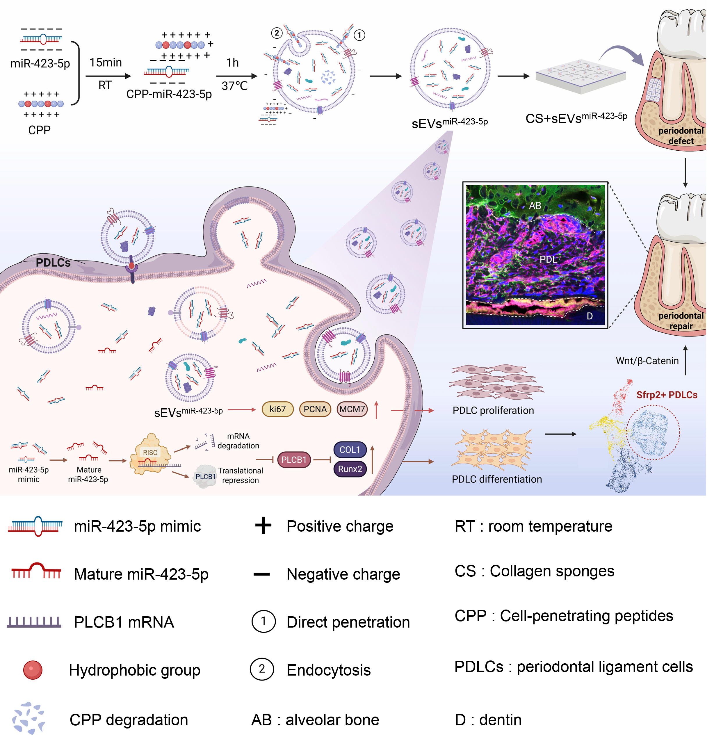 通过对比不同干细胞来源的小细胞外囊泡对牙周膜细胞(PDLCs)的靶向性及功能miRNA分析,证实miR-423-5p是促进PDLC成骨分化的关键成分,其通过靶向PLCB1发挥作用;随后构建出miR-423-5p高丰度的工程化sEVs(sEVsmiR-423-5p),其miRNA装载量较天然sEVs高100,000倍;在体内外实验中,该工程化sEVs可促进牙周缺损部位Sfrp2+成骨成纤维细胞形成,激活Wnt/β- Catenin信号通路,最终实现早期成骨及类天然牙骨质—牙周膜—牙槽骨复合体再生,为个性化纳米囊泡再生疗法奠定基础。