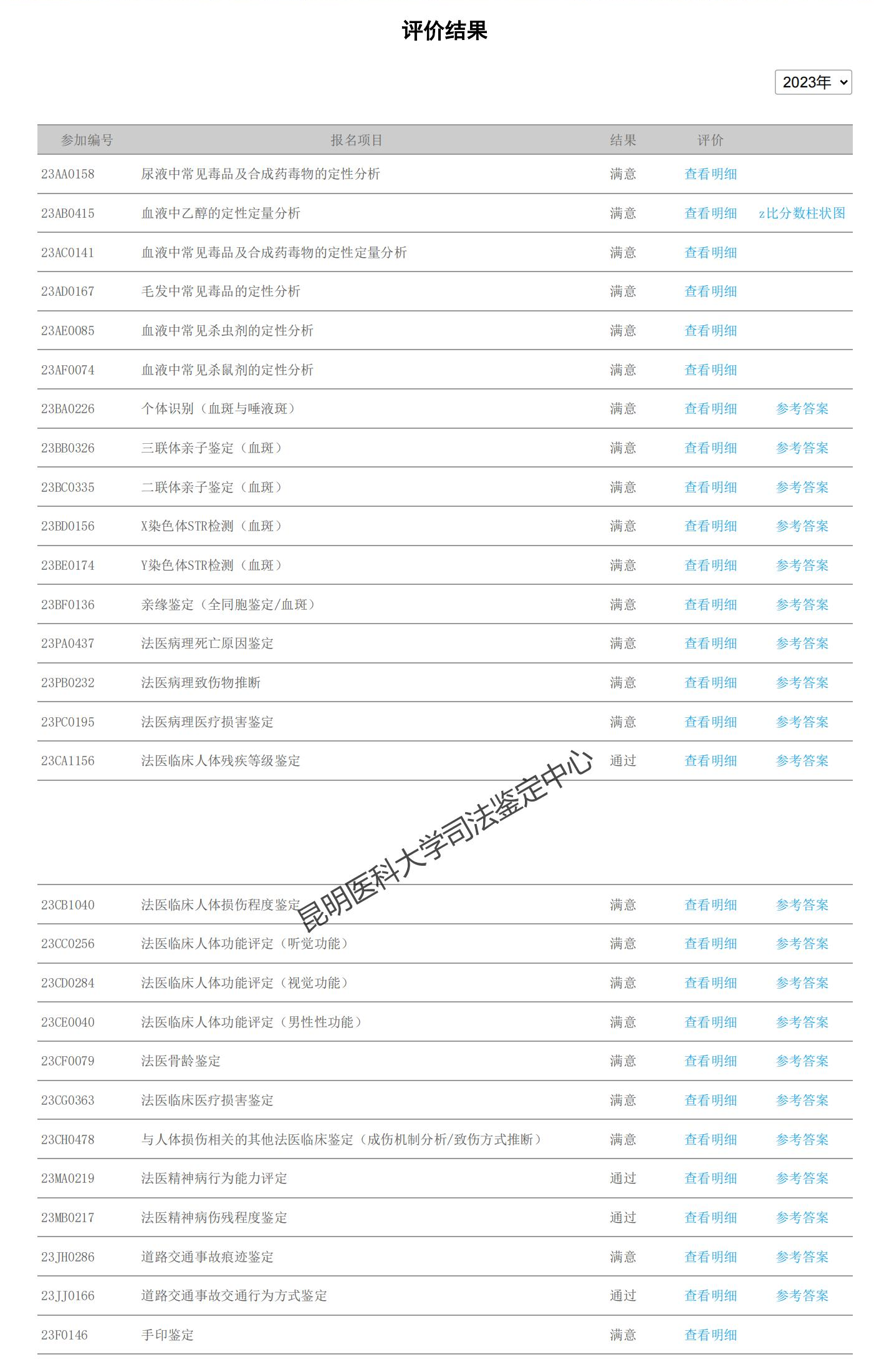 2023年参加的能力验证活动涵盖了法医病理鉴定、法医物证鉴定、法医毒物鉴定、法医临床鉴定、法医精神病鉴定、痕迹鉴定、法医骨龄鉴定等领域。此次能力验证的结果充分展示了中心员工的专业素养和团队协作能力,中心出具的鉴定数据及结果科学、准确、可靠。接下来中心将继续秉持“科学、客观、公正、独立”的方针,进一步提高鉴定技术能力,为社会提供满意可靠的服务。