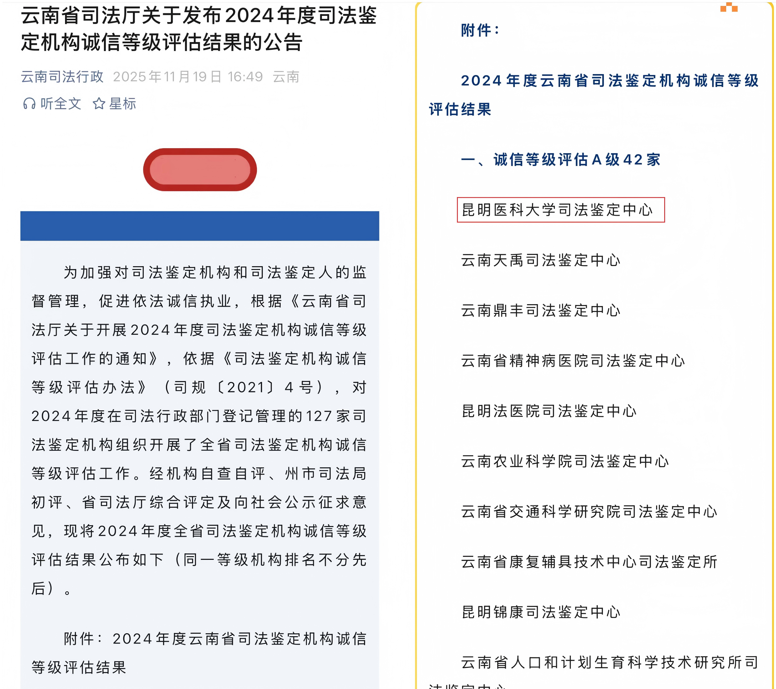 近日,云南省司法厅发布了《关于2024年度司法鉴定机构诚信等级评估结果的公告》,Beat365唯一官方网站司法鉴定中心获评A级。