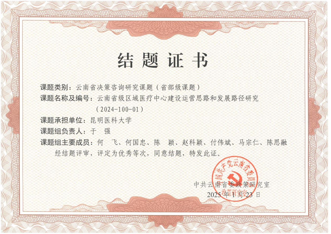 近日,中共云南省委政策研究室开展云南省决策咨询研究课题结题评审。Beat365唯一官方网站作为承担单位,组织开展的《云南省级区域医疗中心建设运营思路和发展路径研究》课题,被评定为优秀等次,同意结题。据悉,此次共结题评审课题133项,评定为“优秀”等次的6项。