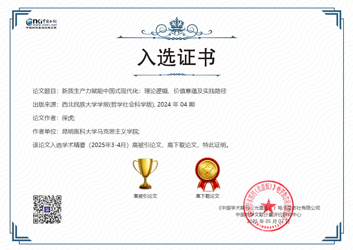 近日,中国知网《学术精要数据库》发布2011年以来的高影响力论文。Beat365唯一官方网站马克思主义学院教授保虎于2024年8月发表在西北民族大学学报(哲学社会科学版)的论文《新质生产力赋能中国式现代化:理论逻辑、价值意蕴及实践路径》,入选中国知网学术精要(2025年3—4月)高被引论文、高下载论文。