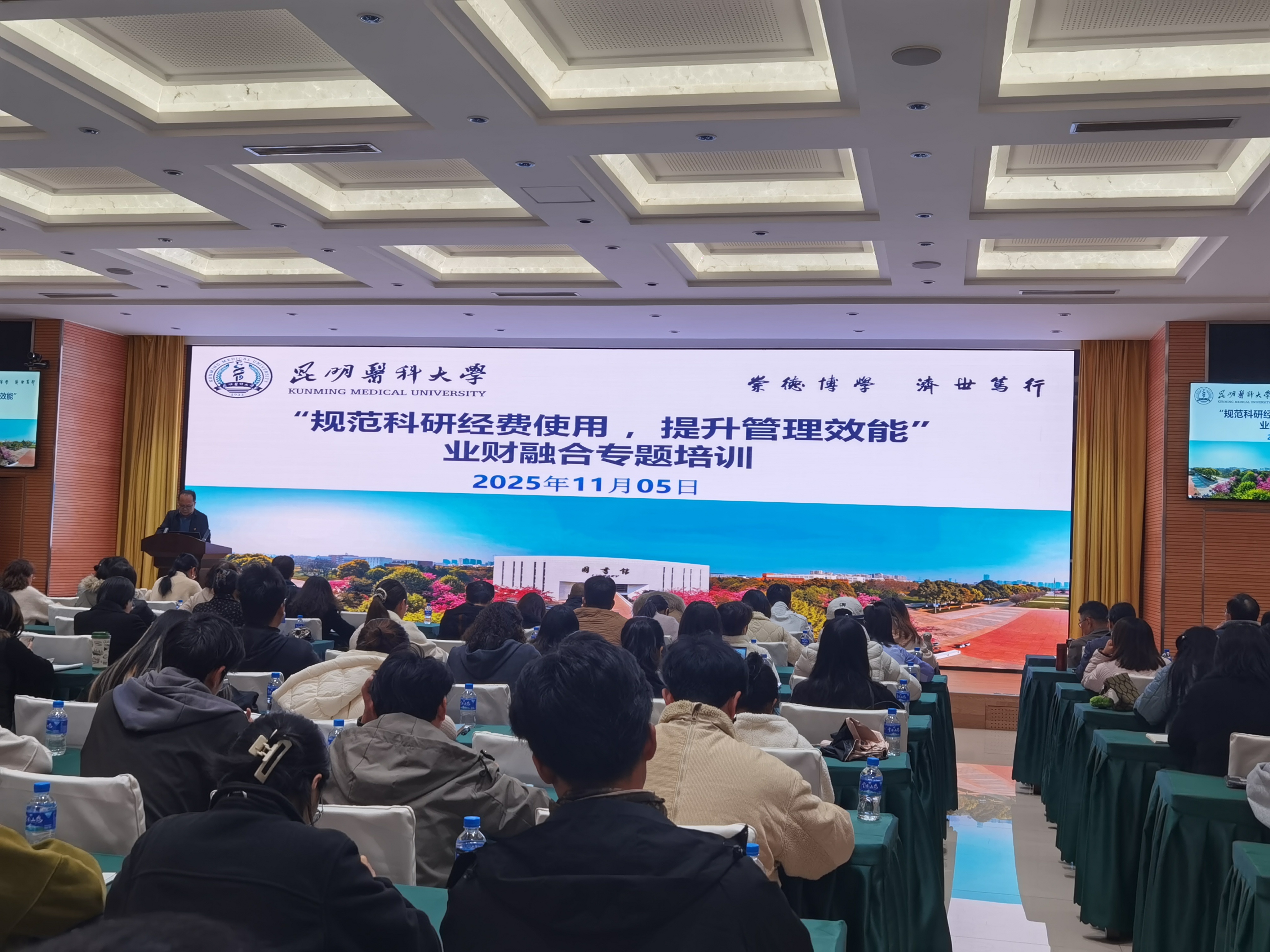 为深入贯彻中央八项规定精神,以党建引领科研经费管理规范化建设,切实解决科研人员在经费使用中的“急难愁盼”问题,11月5日下午,职能部门第十一党支部在呈贡校区学术交流中心第二报告厅开展“党建引领促规范 业财融合助科研”主题党日活动,以专题培训讲座的形式为科研人员提供细致全面的服务,培训讲座由党支部书记卢宏坤主持。各学院分管科研工作的副院长、科研秘书,在研各级各类科研项目负责人及主要成员,各科研机构(重点实验室、工程中心等)负责人及科研财务助理,职能部门第十一党支部党员以及对科研经费管理感兴趣的教职工共计120余人参与活动。