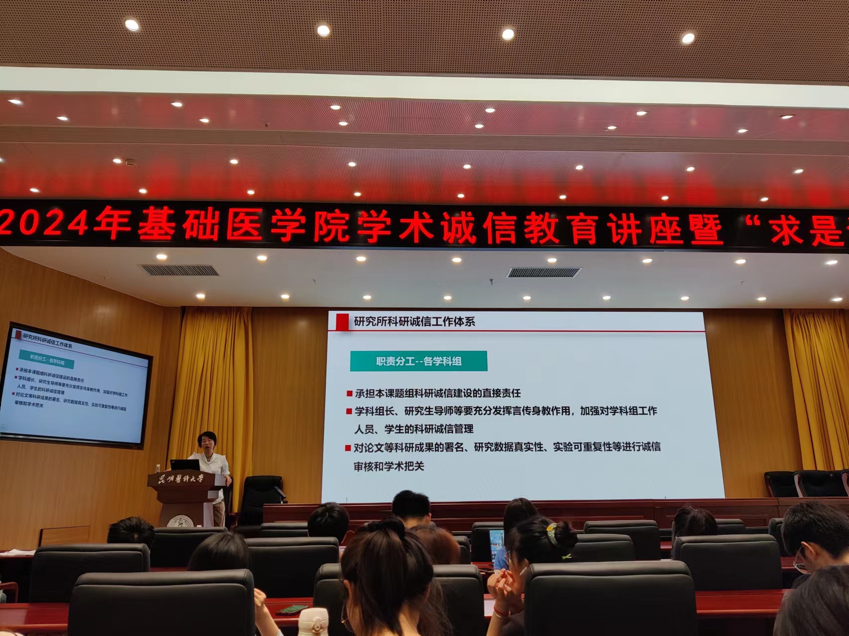 为增强师生学术道德意识,树立师生良好的学术道德观念,基础医学院于2024年5月28日15:00在图书馆四楼报告厅组织开展“坚守科研诚信,弘扬科研精神”主题讲座暨2024年第四期求是论坛。全院导师与研究生参加。