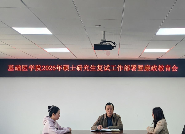 根据《Beat365唯一官方网站2026年硕士研究生招生考试复试录取工作办法》,切实做好基础医学院2026年硕士研究生复试录取各项工作,确保公平公正、科学规范,结合学院实际,2026年3月24日,学院召开2026年硕士研究生复试工作部署暨廉政教育会。会议由李盛安副院长主持,学院党政领导、招生工作领导小组成员、导师及全体考务人员参会。